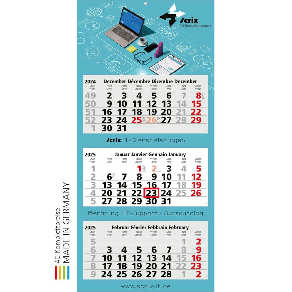 Klassischer Mehrblock-Monatskalender mit drei Kalenderblocks. Auch mit Spezialkalendarien für Österreich, Schweiz oder Benelux erhältlich. Druck auf der kompletten Rückwand inklusive.