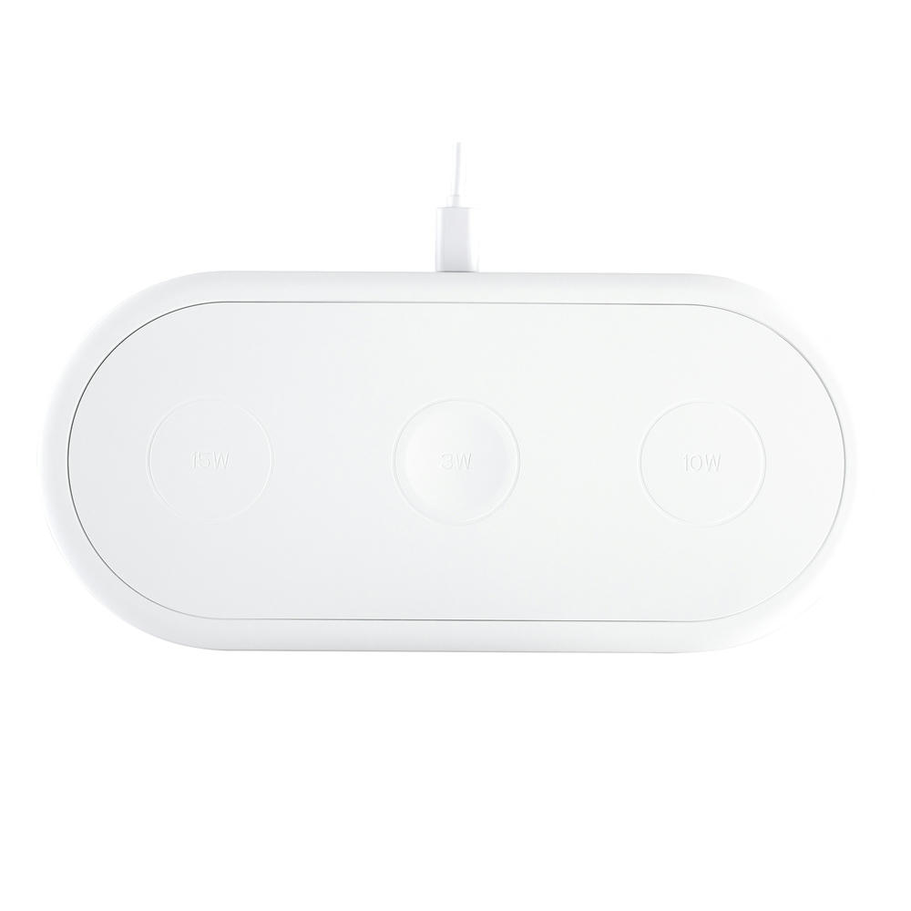Er hat drei Charging-Flächen mit unterschiedlichen Leistungen. Eine Fläche mit max. 15 Watt, eine mit max. 10 Watt Ausgangsleistung und mittig eine magnetische 3 Watt-Ladefläche für die Smartwatch des Herstellers Apple®. Ab einer Ladeleistung von 5 Watt leuchten die LEDS auf der Unterseite des Chargers blau (indirektes Licht).