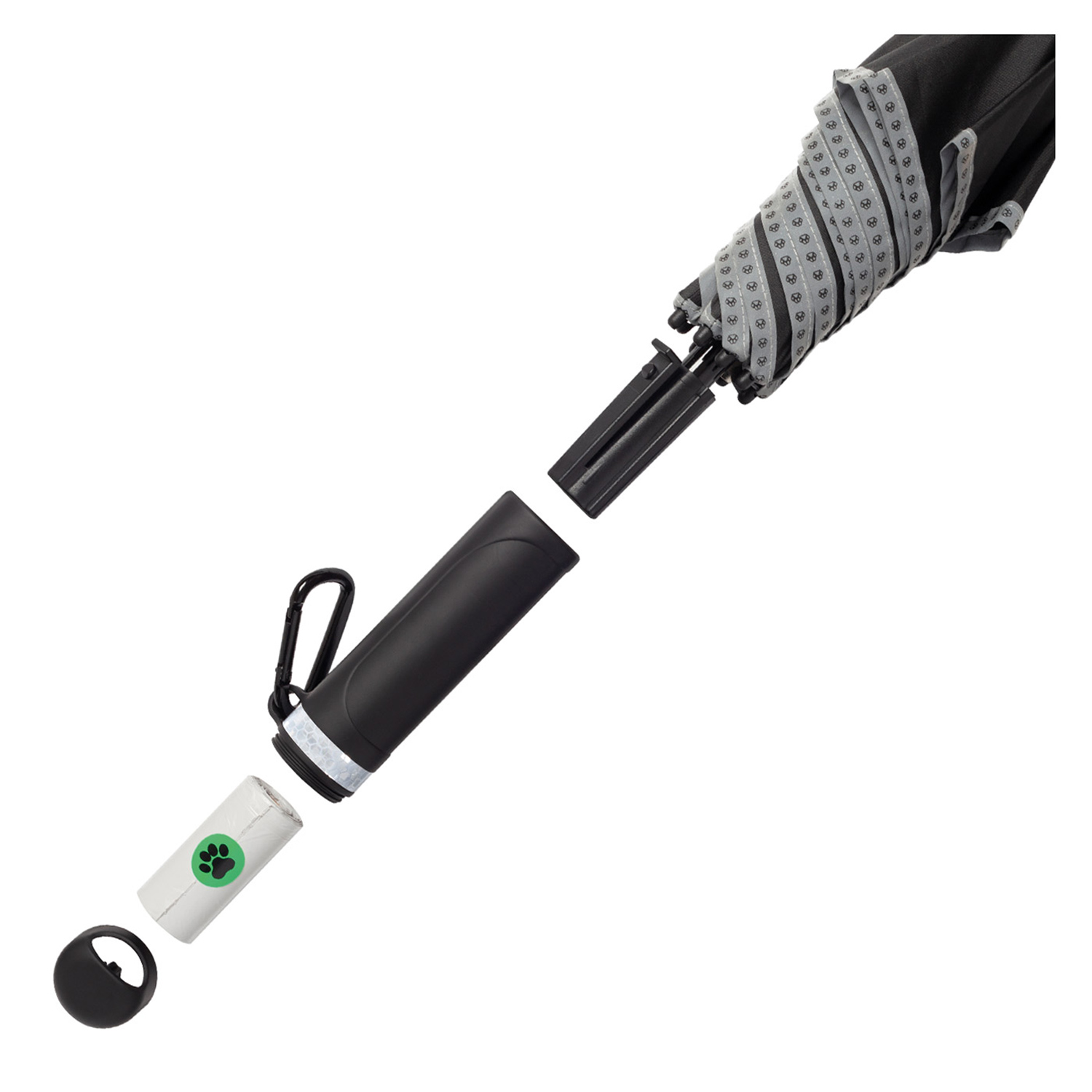 Automatik-Gästeschirm mit abnehmbarem Soft-Feel-Griff mit silber reflektierendem Streifen, befüllt mit 15 Hundekotbeuteln. Windproof-System für eine maximale Gestell-Flexibilität, flexible Fiberglasschienen, Fiberglasstock bedruckt mit Pfotenabdrücken in silber. Griff mit Karabinerhaken zur Befestigung an Gürtel, Tasche oder Hundeleine, Deckel zum Nachfüllen abschraubbar, Auslösetaste mit Pfoten-Sticker und Werbeanbringungsmöglichkeit.
