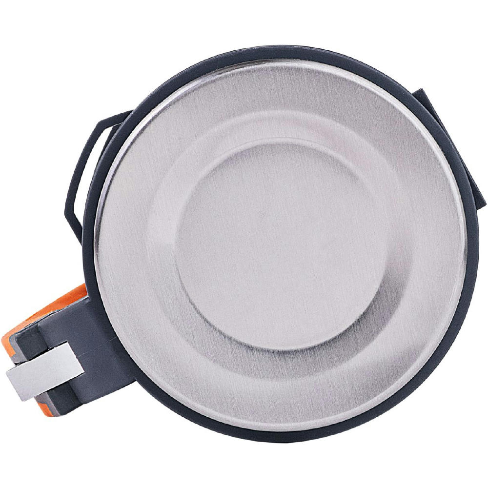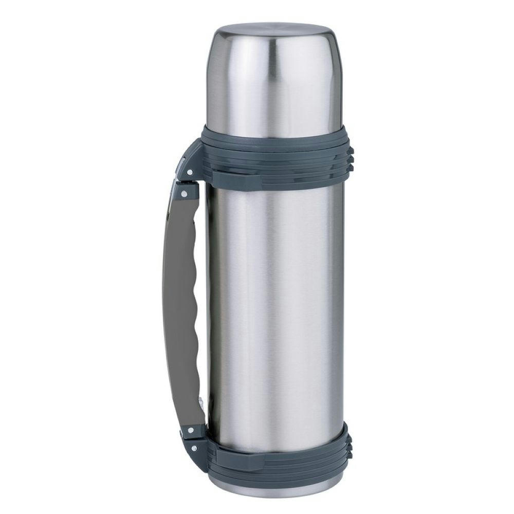 Vakuumflasche mit Schraubdeckel als Trinkbecher und stabilem Klappgriff.