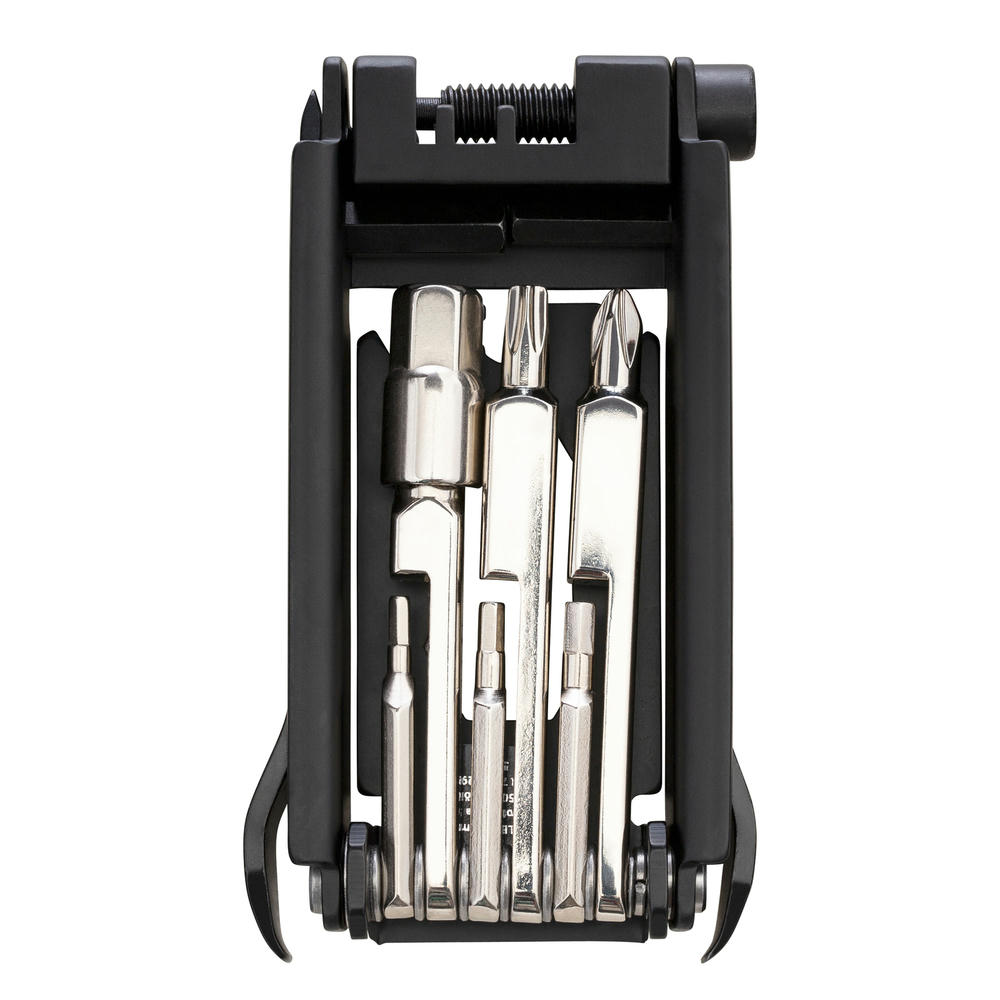 Mit Sechskantschlüssel, Sechsrundschlüssel, KettenSCHNEIDER, Werkzeug zum Reifen-/Schlauchwechsel und Flaschenöffner, Lineal sowie Winkelmesser.