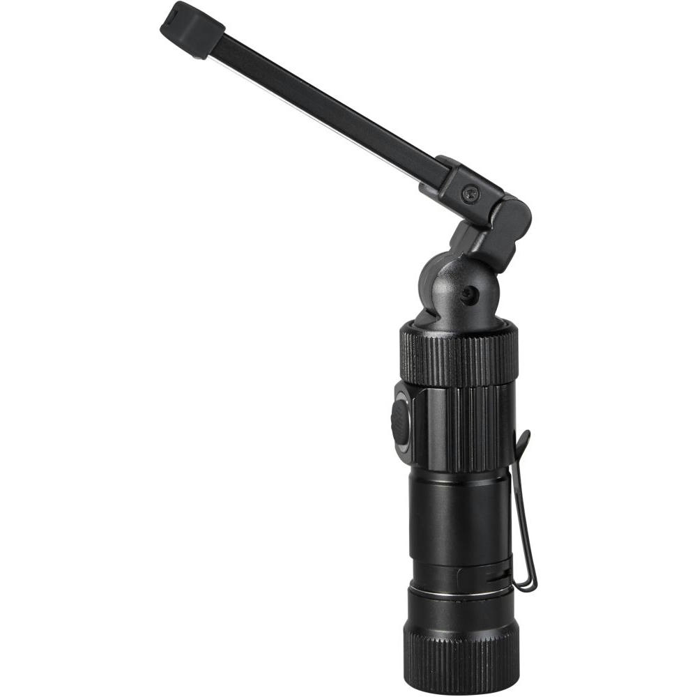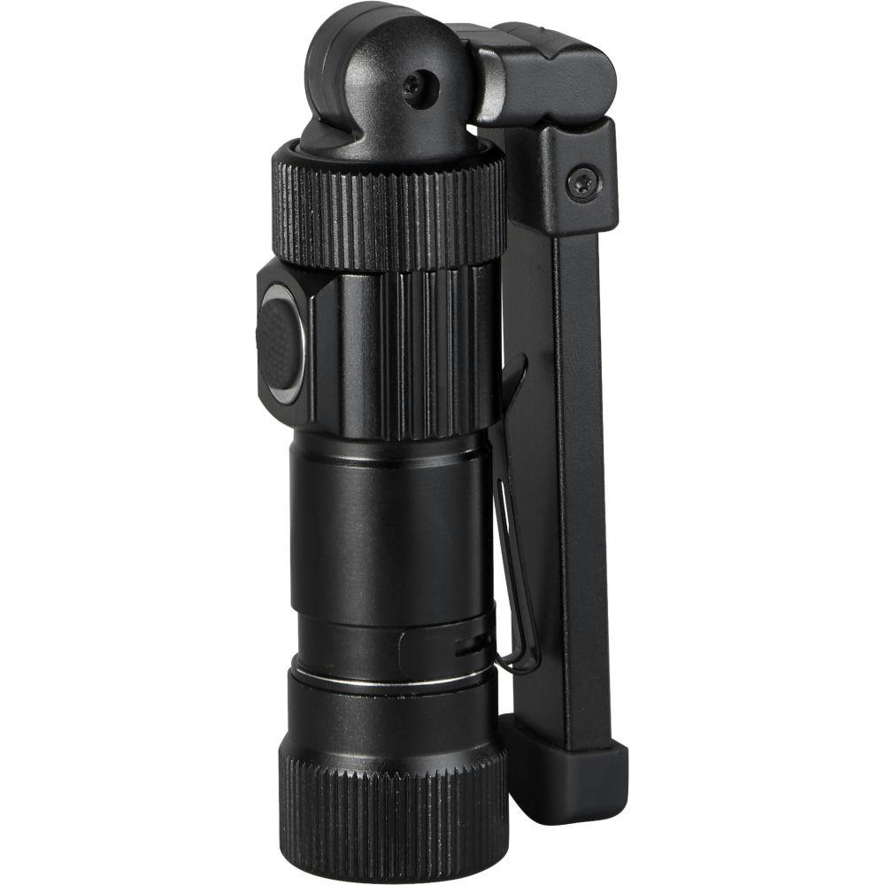 Taschenlampe aus Aluminium mit überraschenden Fähigkeiten: schwenkbarer Leuchtenkopf, per USB aufladbare Batterie (500 mAh), Magnet, Clip, USB-Stecker unter der hinteren Abdeckung. 5 durchschaltbare Lichtmodi: hell (300 Lumen) / halbe Leuchtstärke (150 Lumen) / Punktlicht / rot / rot blinkend.