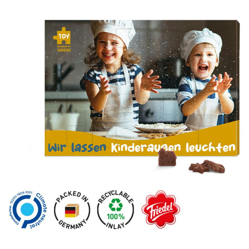 Rätsel Adventskalender in Vollkartonhülle, Querformat, recycelbar, mit Rätselmotiv "Weihnachtsdinner". Im unteren Teil des Kalenders ist Platz (Ca. 345 x 25 mm mm) für dein Logo und deinen individuellen Weihnachtsgruß. Ein Teil des Ertrags dieses Kalenders unterstützt die Albert Schweitzer Kinderdörfer und Familienwerke. Inhalt: 24 Friedel Vollmilch Schokoladentäfelchen, 70 g.