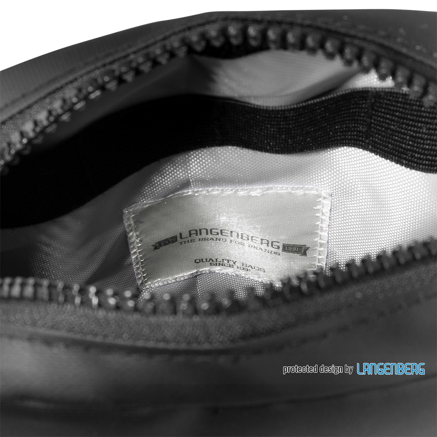 Reißverschlusshauptfach innen mit Einsteckfach sowie 4 elastische Schlaufen, Reißverschlussvortasche mit kleinem Kunststoffkarabiner, abnehmbarer Tragegurt, Volumen ca. 2l
