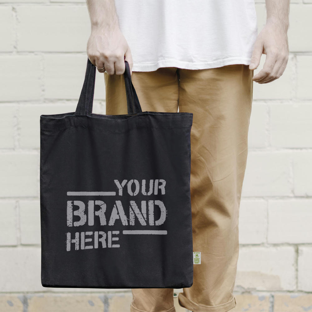 Tasche aus recycelter schwerer Baumwolle mit kurzen im Kreuzstich vernähten Henkeln und RE-cotton label aussen. Gegen Aufpreis auch mit langen Henkeln erhältlich.