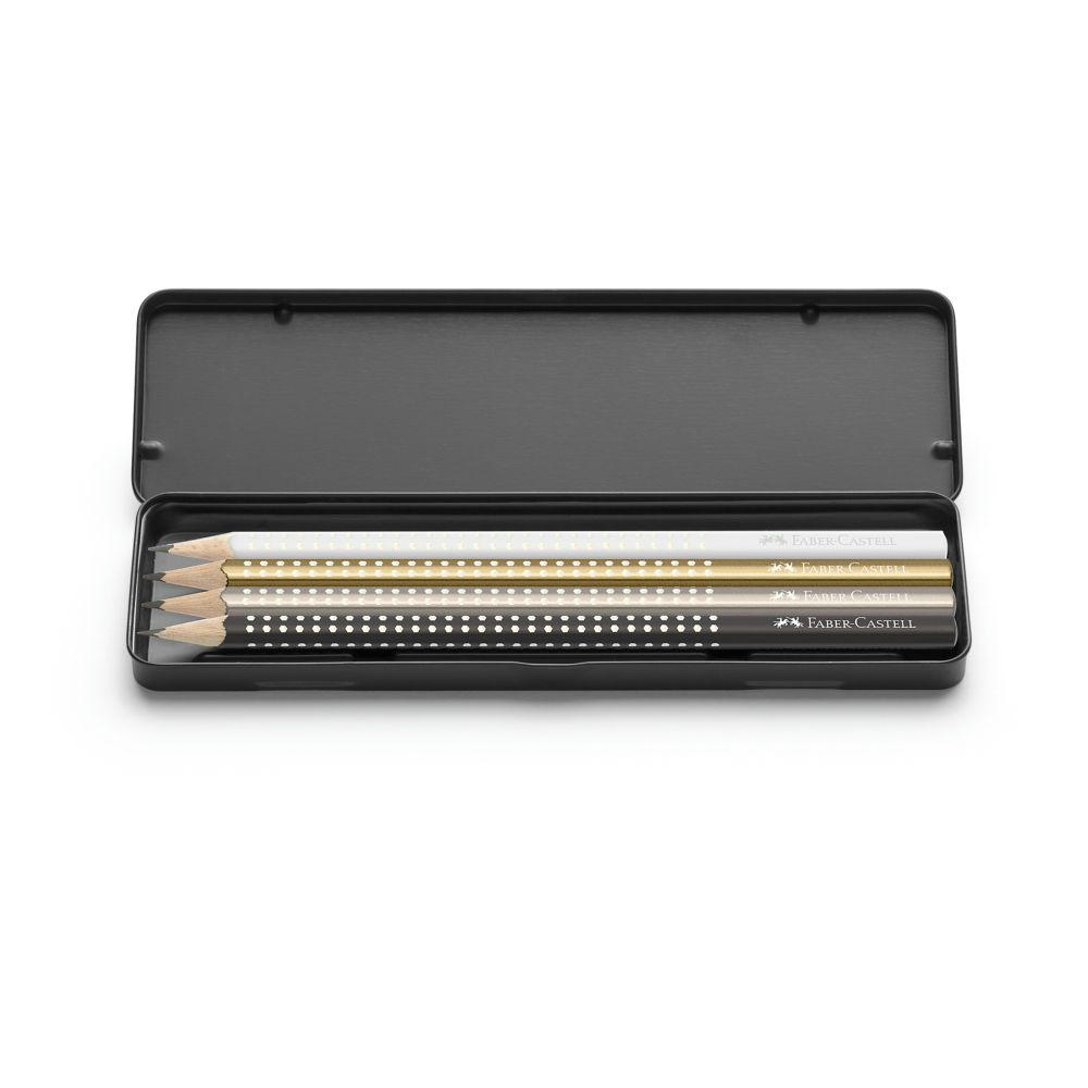 4 Bleistifte mit Glitzereffekt nach Wahl im Blechetui. Material: Metall, Holz. Farben saisonal wechselnd. Maße: 18,3 x 5,4 x 1,1 cm (Etui).