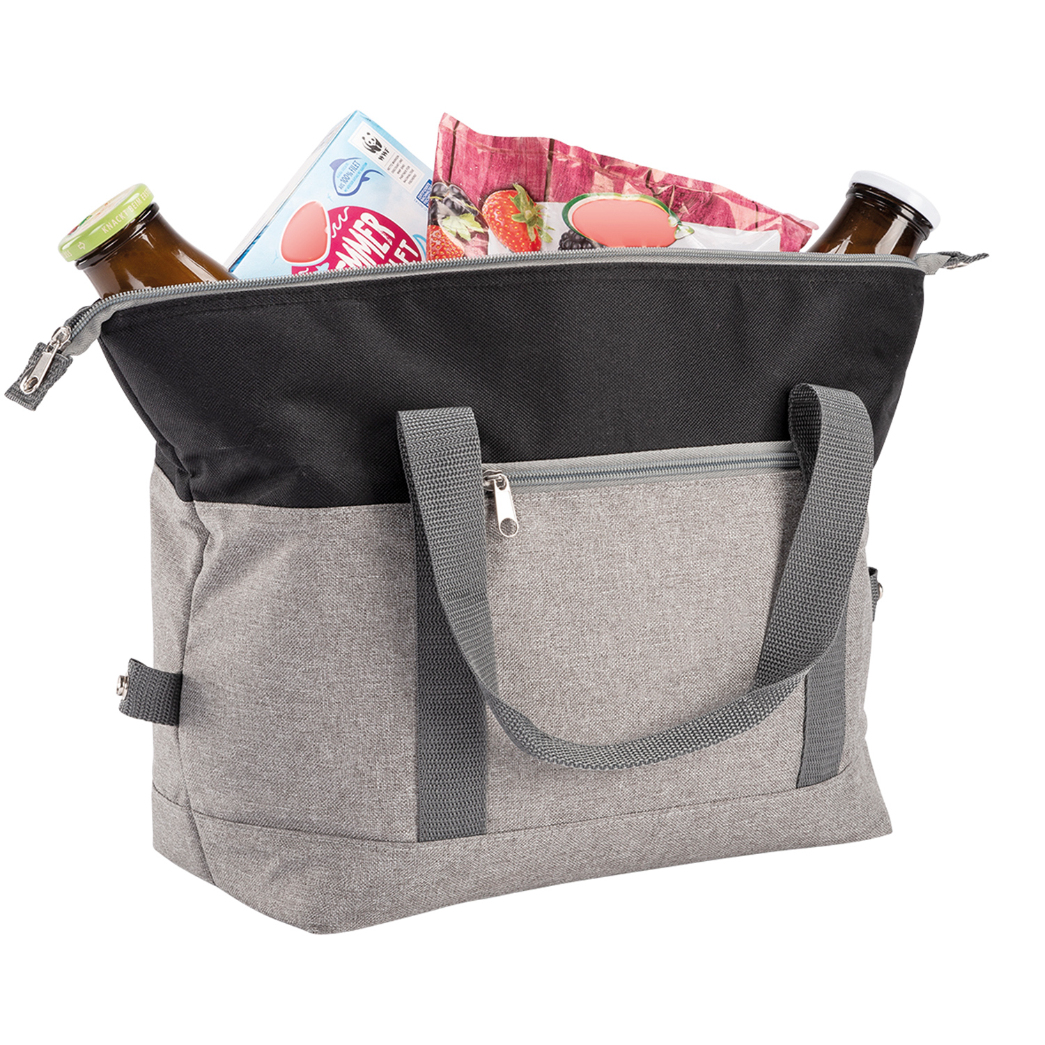 2-Wege Reißverschlusshauptfach Reißverschlussvortasche Druckknöpfe links+rechts seitlich gepolsterter Tragegriff Kühlfunktion aus PEVA Rückseite mit Vario Top Haken von Rixen & Kaul zur Befestigung an einem Gepäckträger Volumen: ca. 13 L.