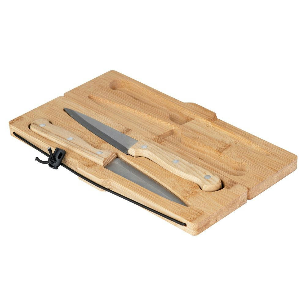 Material: naturbelassenes Bambus, Edelstahl. Maße: 29 x 9,3 x 3,1 cm (geschlossen), 29 x 18,6 x 1,55 cm (geöffnet).
