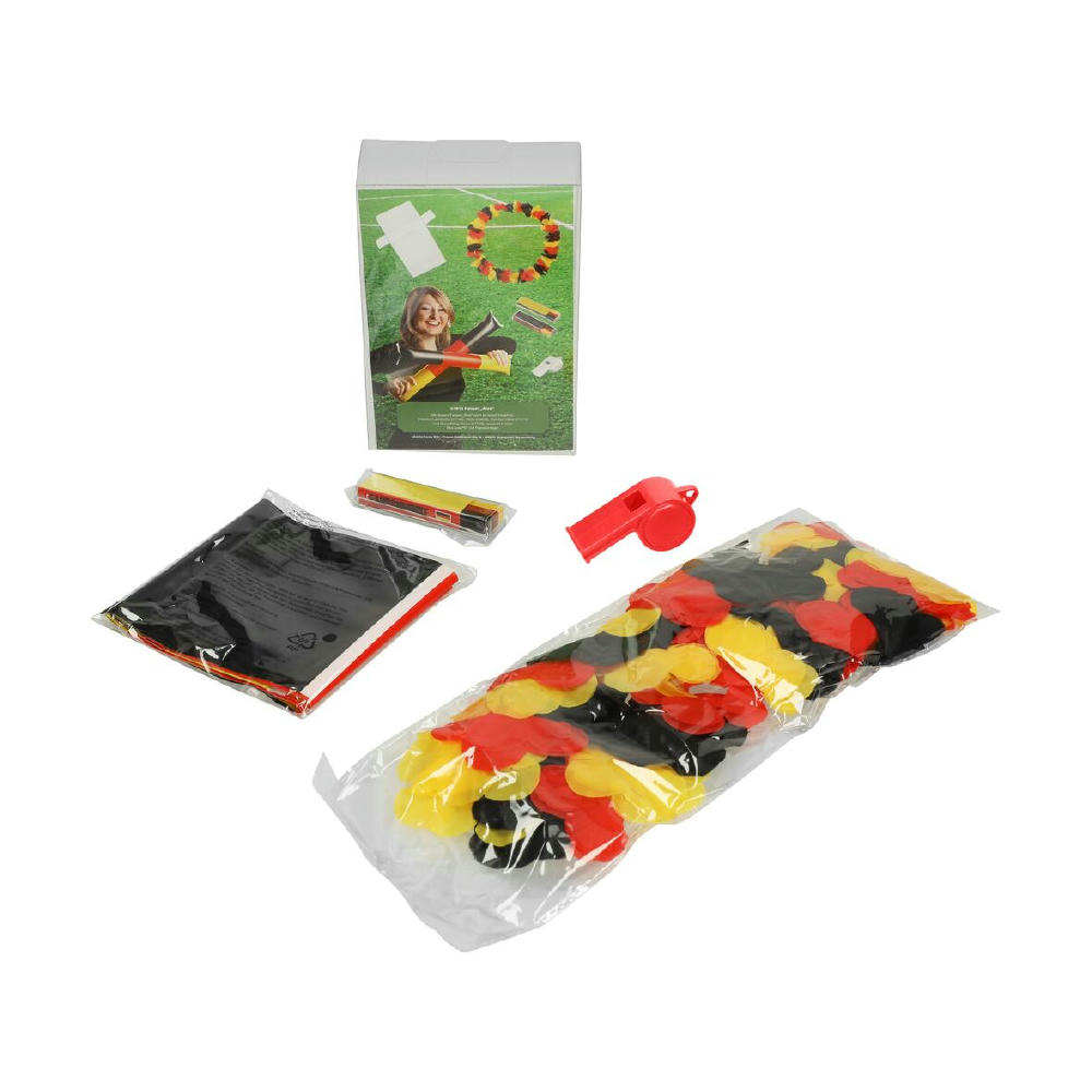 Inklusive Laolakette (07798), Pfeife (03636), Fanschminke (07270) und Klopfschlauch "Sticks" (07740), verpackt in PVC Box mit Papiereinleger. Beim Einleger kann zwischen Standard (siehe Abbildung) oder einem individuell gestalteten Einleger gewählt werden.