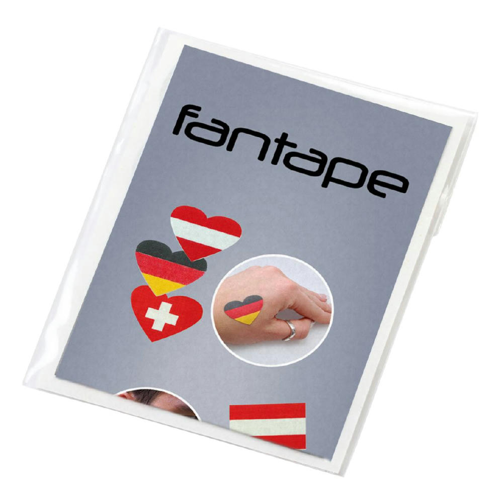 Set mit Pflastern in Herz-Form. 4-farbiger Papiereinleger (55 x 75 mm) und Polybeutel inklusive. Optimal als Körperschmuck oder Aufkleber für Textilien geeignet. Hergestellt nach den Vorschriften für medizinische Fixierpflaster. Beim Einleger kann zwischen Standard (siehe Abbildung) oder einem individuell gestalteten Einleger gewählt werden.