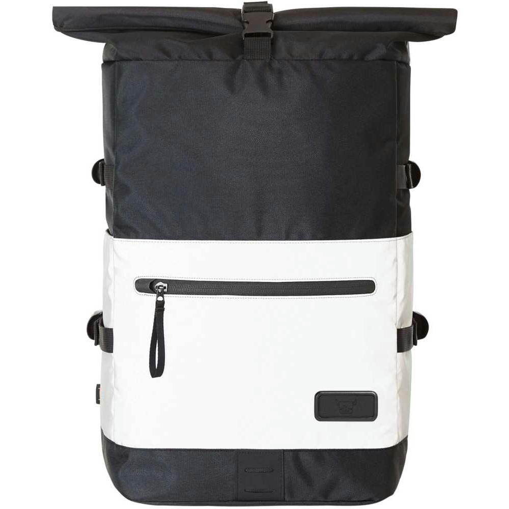Refektierender Rolltop-Rucksack mit Reißverschluss-Hauptfach und Steckverschluss; HFL®-Träger für Ihr Logo; gepolstertes Einsteckfach und Reißverschluss-Netzfach innen; zwei seitliche Einsteckfächer; Fixiergurte; Reißverschluss-Vortasche; LED-Fahrradlicht-Befestigungsmöglichkeit; rückseitige Befestigungsschlaufe für Trolley-Gestänge; verstecktes Reißverschluss-Fach; gepolstertes Tragesystem mit höhenverstellbarem Brustgurt; Handgriff.