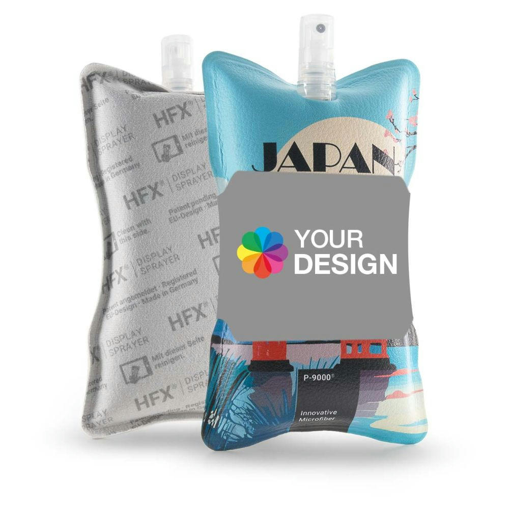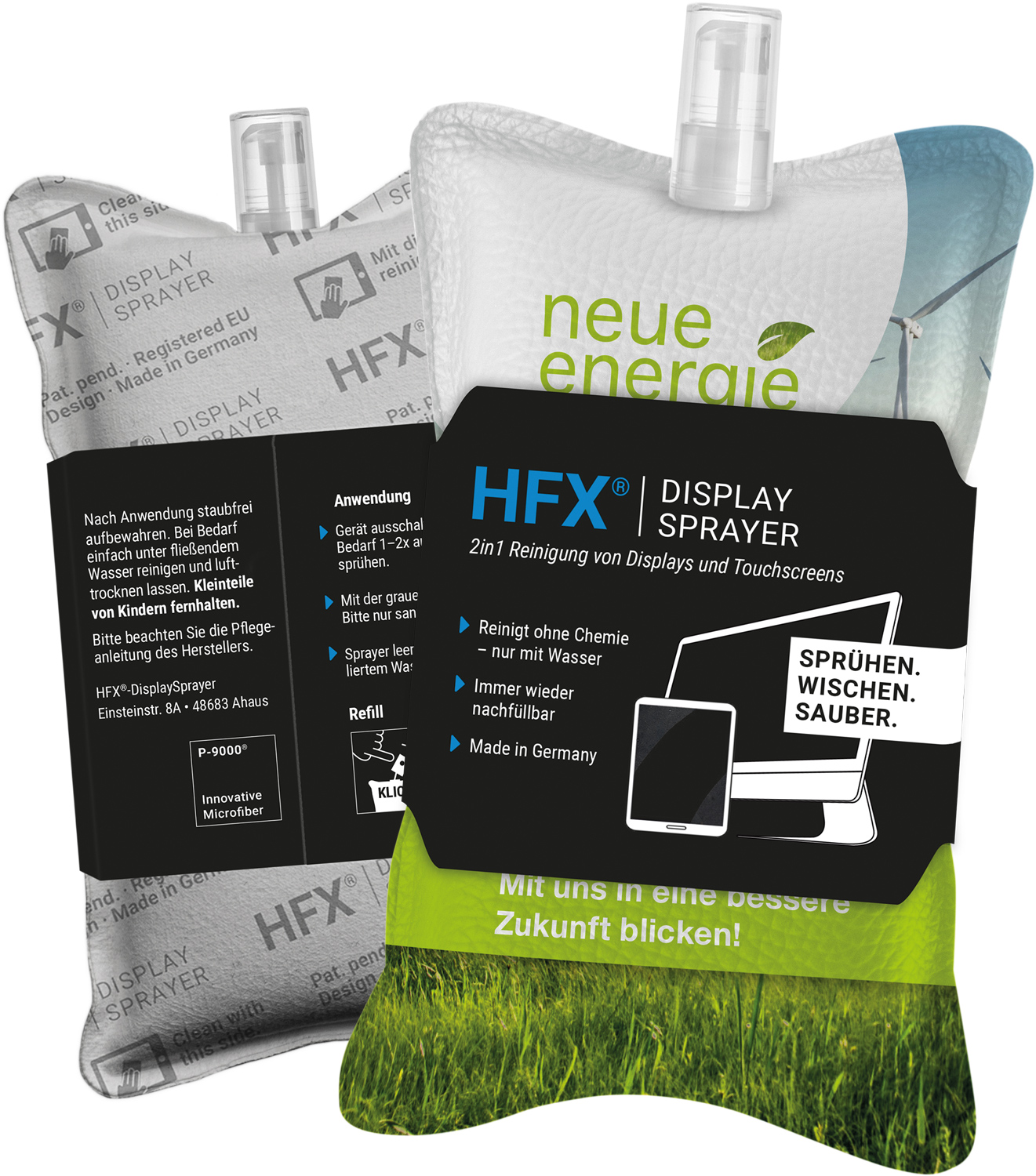 Vereint zwei Funktionen in einem Tool: Sprühen, wischen — und sauber ist das Display, ob im Büro oder im Auto . Frei von chemischen Reinigungsmitteln, Alkohol sowie Ammoniak. Die Kombination aus P-9000® Microfaser sowie vorzugsweise destilliertem Wasser, entfernt Fingerabdrücke rückstandslos und sorgt für schlierenfreie Displays. Nachfüllbar. Verpackt in einer Papierbanderole mit individuellem 4/0 Druck. Made in Germany. Preis inkl. vollflächigem 4/0 Druck, inkl. Einzelverpackung, inkl. Druckvorlaufkosten und inkl. Versandkosten an eine Adresse in Deutschland auf dem Festland.