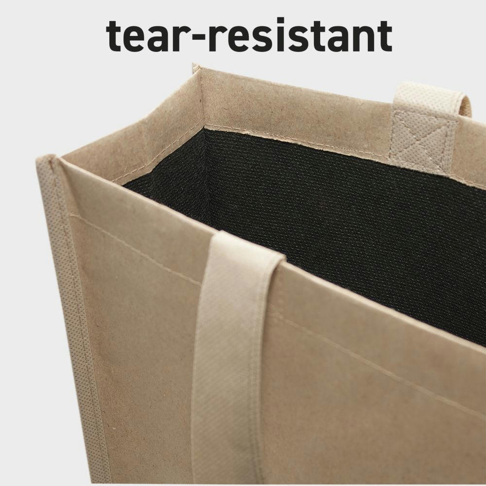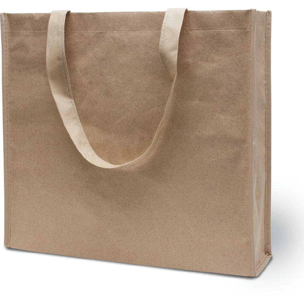 Reißfeste Tasche aus einer besonders langlebigen Materialfusion mit Non-woven (150 g/m²) innen und recyceltem Kraftpapier außen. Henkel: 60cm.