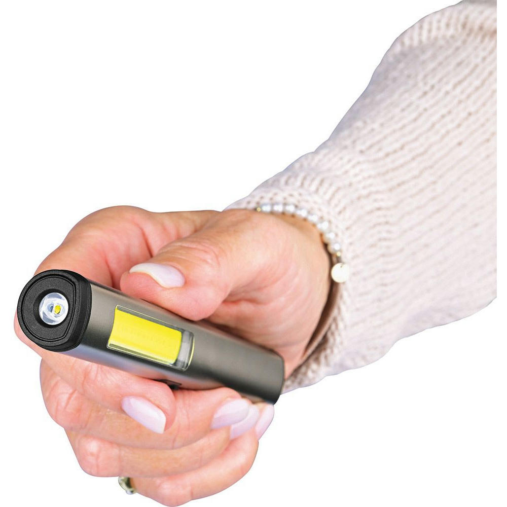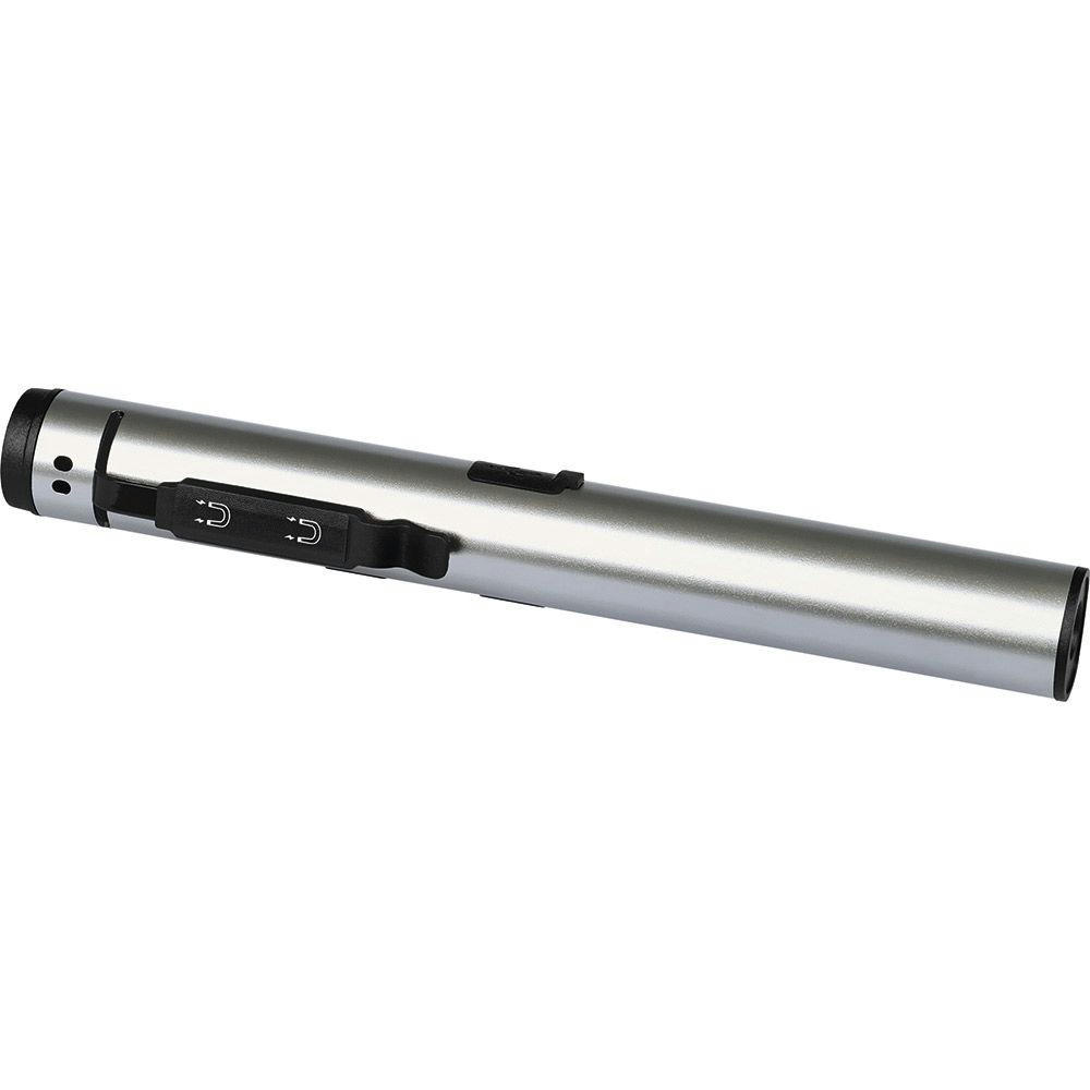 Gehäuse: Aluminium eloxiert. Leuchtmittel: Frontleuchte 5 W COB LED, Inspektionsleuchte 3 W LED, Laser 650 nm, UV-Licht 365 nm. Lichtwerte: Frontleuchte 450 Lumen, Inspektionsleuchte 140 Lumen. Ladezeit: ca. 3 Stunden. Leuchtdauer: ca. 2,5 Stunden (Frontleuchte 450 Lumen), ca. 2,5 Stunden (Inspektionsleuchte 140 Lumen), ca. 4 Stunden (UV-Licht). Leuchtmodi: Frontleuchte 100 % Power weißes Licht dimmbar, Inspektionsleuchte 100 % Power weißes Licht dimmbar, UV-Licht blau dimmbar, Laser rot. Equipment: 120° drehbarer Clip mit starkem Magnet, Ladekontroll-LED, USB (Typ A) / USB (Typ C) Ladekabel (50 cm Länge). Schutzklasse: IPX2. Stromversorgung: 3,7V 800mAh Li-Ionen Akku Typ 14500 (inkl.). Verpackung: schwarze Geschenkverpackung.