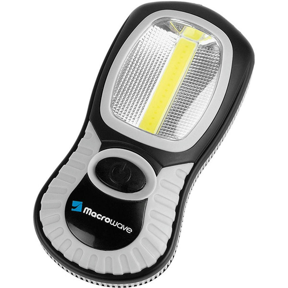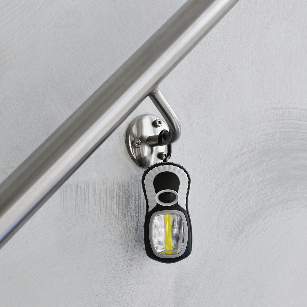 Arbeitsleuchte mit 3W COB LE D und 3 DIP LE D. Lichtwerte: Arbeitsleuchte 230 Lumen, Taschenleuchte 30 Lumen. Leuchtdauer: ca. 20 Std. Leuchtmodi: 100% Power weißes Licht. Starker vernickelter Magnet, 360° drehbarer Fixierhaken. Inkl. 3 AAA Batterien. In schwarzer Geschenkverpackung.
