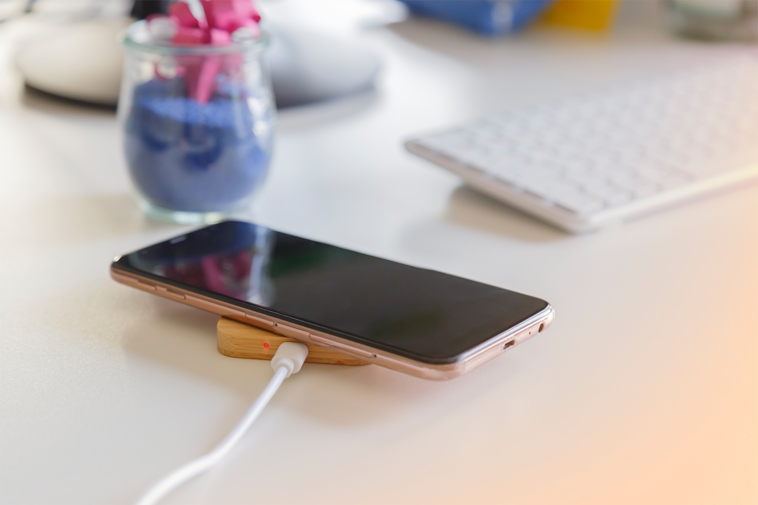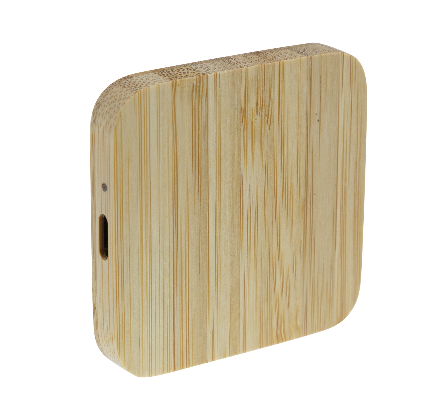 15 Watt WirelessCharger in Bambusgehäuse mit TypC Ladeanschluß und USB/TypC Anschlußkabel. Braune Einzelverpackung.