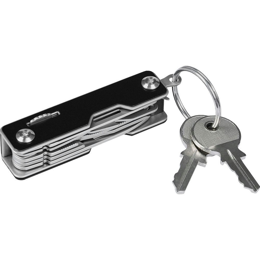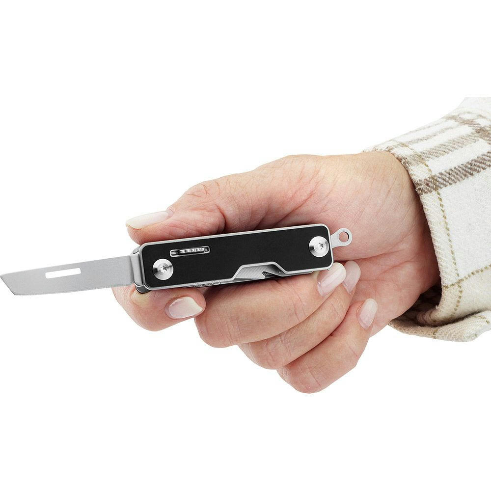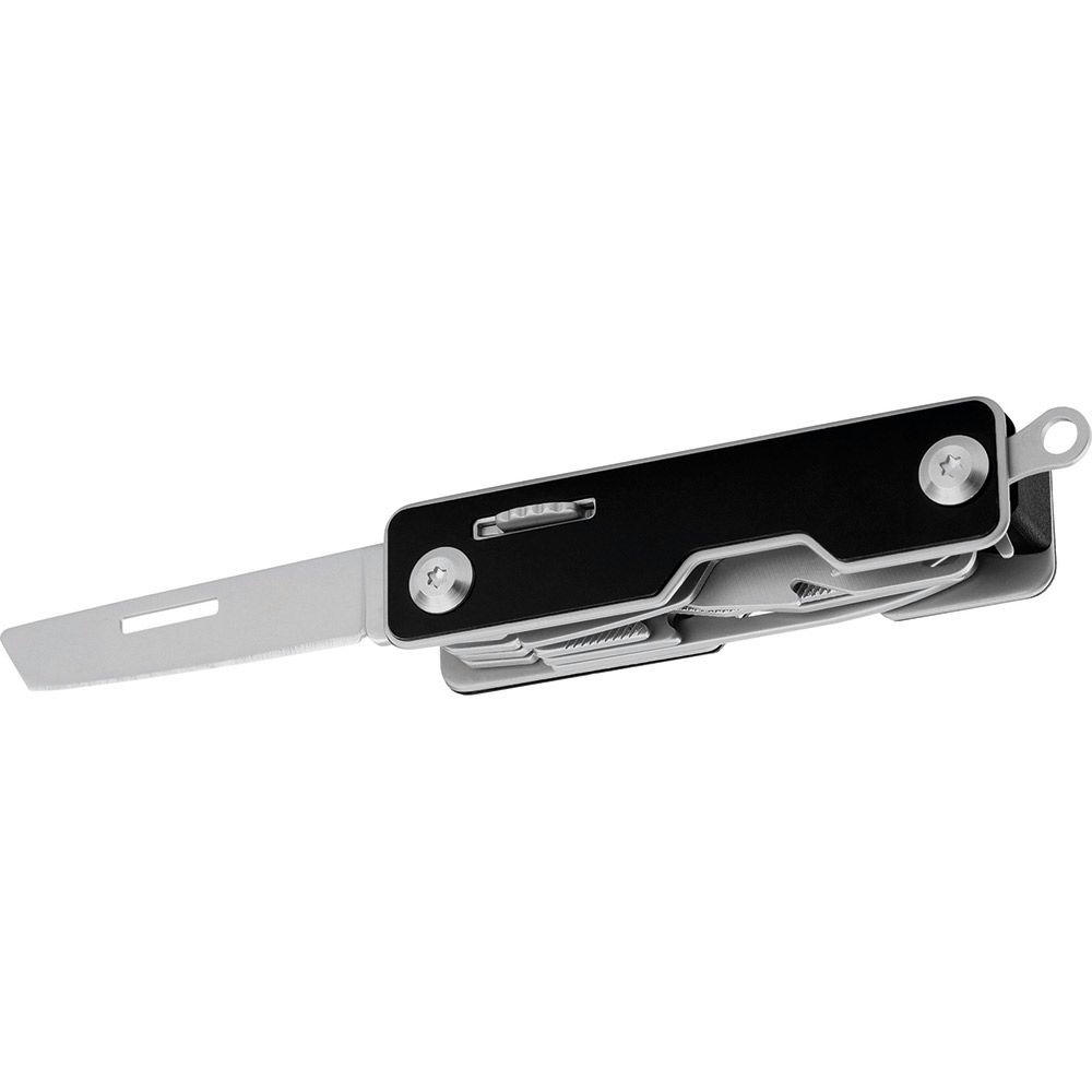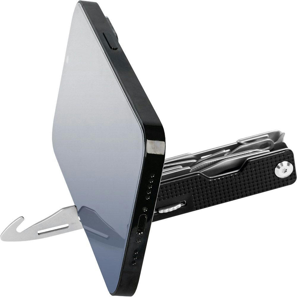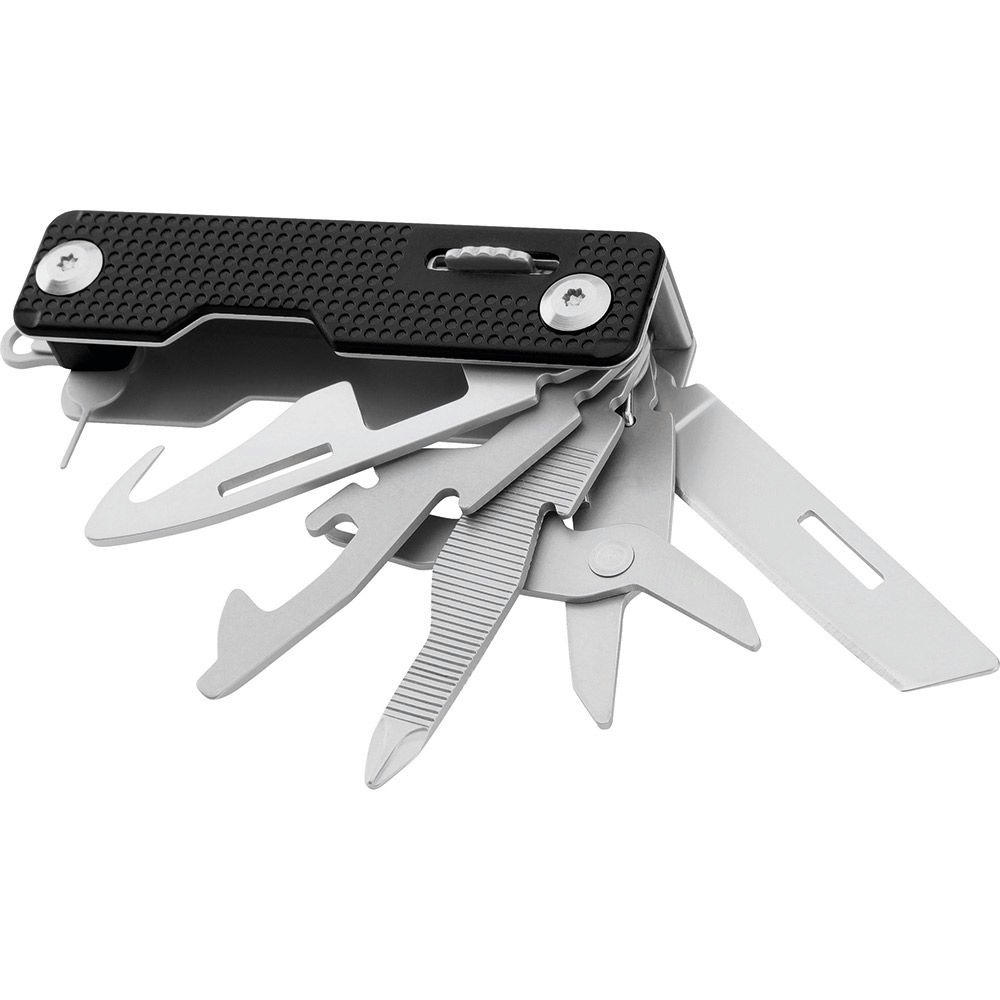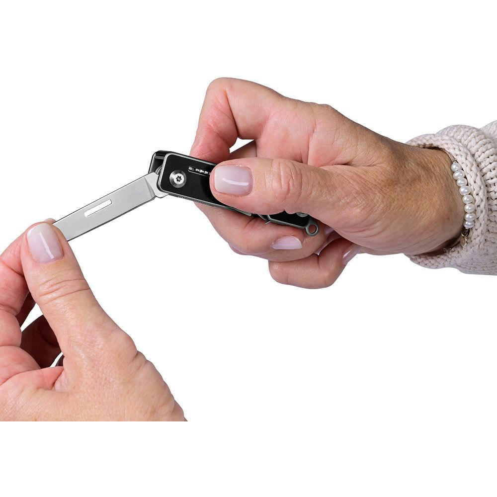 Multifunktions-Werkzeug mit 12 Funktionen. Für Rechts- und Linkshänder geeignet. Funktionen: Taschenmesser (Klingenlänge 53 mm), Schere, Metallfeile, Schlitzschraubendreher, Phillips-Schraubendreher, Dosenöffner, Flaschenöffner, Hakenklingen-Cutter, Smart
