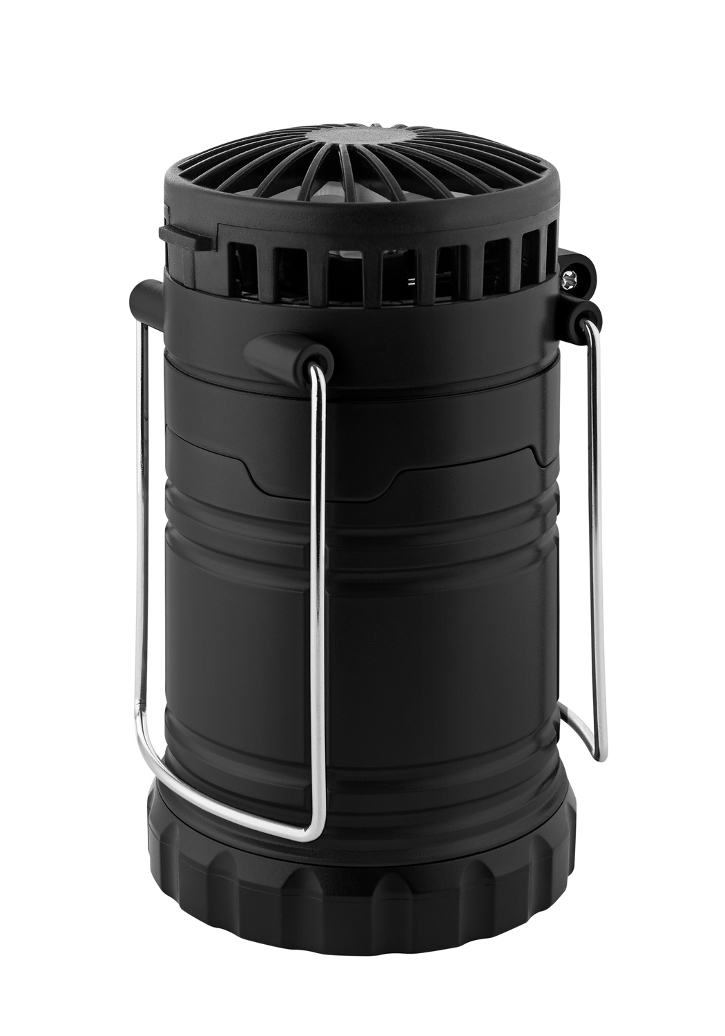 Lichtwunder für die Terrasse und Unterwegs, eco friendly, da wiederaufladbar mit warm-weißem regulierbarem LED-Licht und für heiße Tage mit aufstellbarem 2- stufigem Ventilator, mit USB-C Anschluss und 500 mAh Akku, incl. Aufhängebügel.