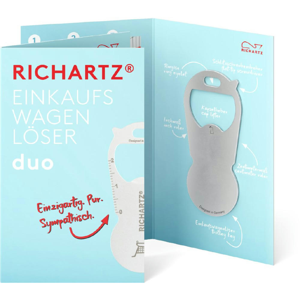 Durch die Kombination aus Einkaufswagenlöser, Flaschenöffner & Co., werden sie schnell zum unverzichtbaren Begleiter am Schlüsselbund. Unterschiedliche Formgebungen: von technisch bis sympathisch. Ein idealer Mailingartikel für jede Branche und jeden Anlass. Preis inkl. indiv. 4/4-c bedruckbarer Trägerkarte und inkl. Lasergravur auf dem Tool.
