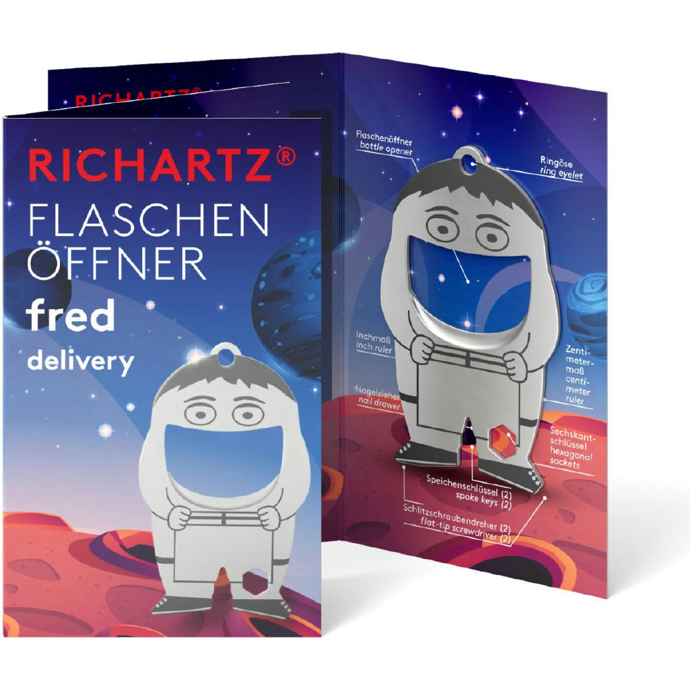 Der sympathische Flaschenöffner überzeugt durch seine schöne, kompakte Form und passt daher an jeden Schlüsselbund. Sein perfekt konstruierter Flaschen­öffner löst problemlos jeden Kronkorken und mit 9 weiteren nützlichen Funktionen wird er schnell zum unverzichtbaren Begleiter im Alltag. FLASCHENÖFFNER von RICHARTZ®: So praktisch und immer dabei!