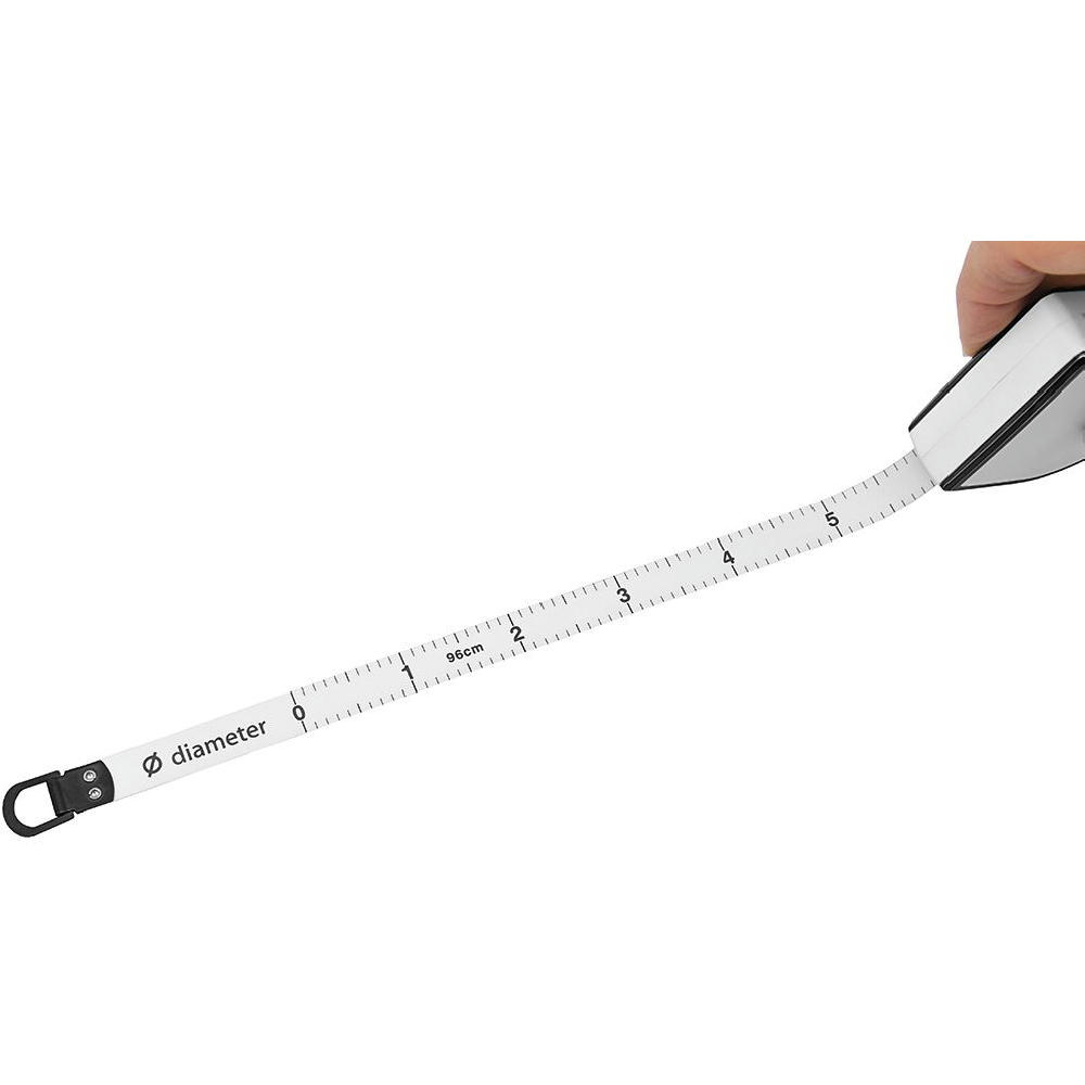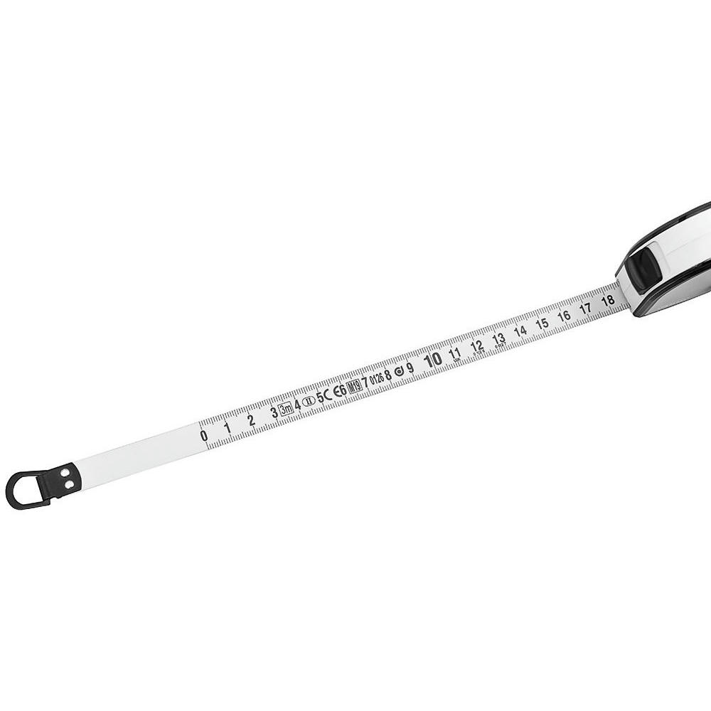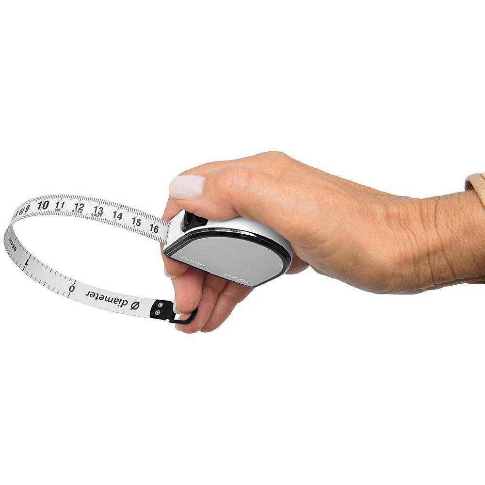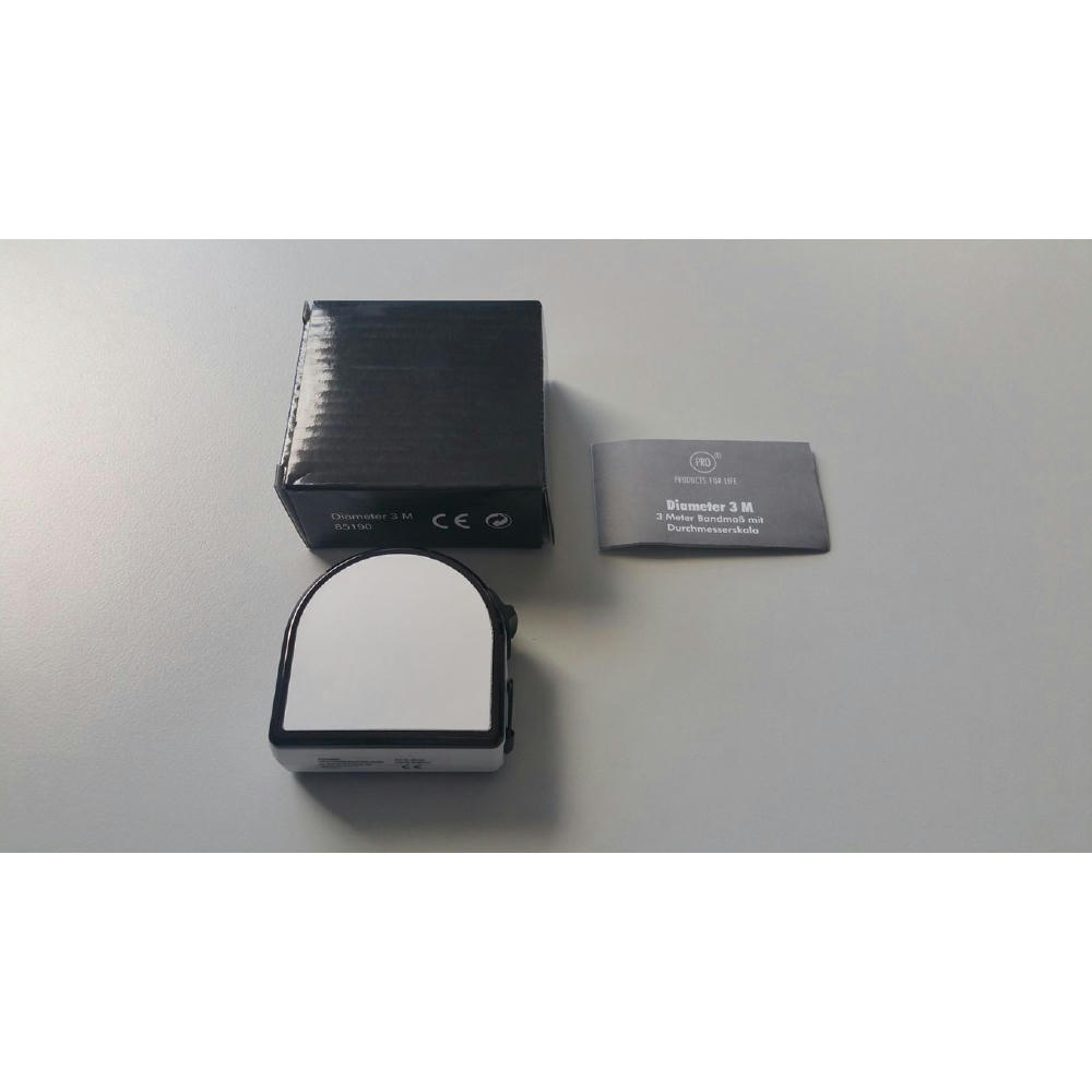 Bandmaß mit Durchmesserskala. Schlagfestes Gehäuse. Mit dyn. Bandrücklauf. Band: 3 m/13 mm, lackiert. Skalierung: cm, zweiseitig (Länge/Umfang, Durchmesser). Genauigkeit: EG -Klasse II . In schwarzer Geschenkverpackung.