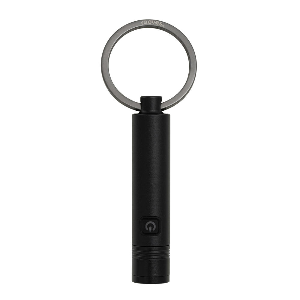 Schlüsselanhänger mit wiederaufladbarer LED-Taschenlampe (80 Lumen) mit USB-C-Anschluss aus schwarz eloxiertem Aluminium . Verstellbare Lichtintensitäten (zoombar auf 50% oder 100% Leuchtkraft). Leuchtdauer: 30 Minuten bei 100% Leuchtkraft; 75 Minuten bei 50% Leuchtkraft. 2,5 Stunden Ladezeit, 120 mAh Akku. Spritwassergeschützt IPX4. Inklusive USB-C-Ladekabel und Geschenkverpackung.