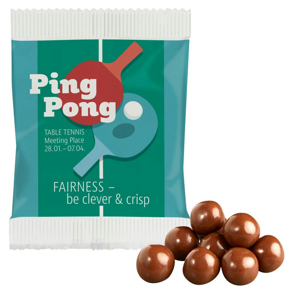 Schokoknusperkugeln mit knusprigem Kern aus Vollkorn, umhüllt von feinster Vollmilchschokolade in weißem Papierwerbetütchen verpackt. Haltbarkeit: ca. 4 Monate bei sachgerechter Lagerung. Inkl. 1-4c-Druck.