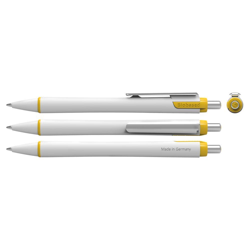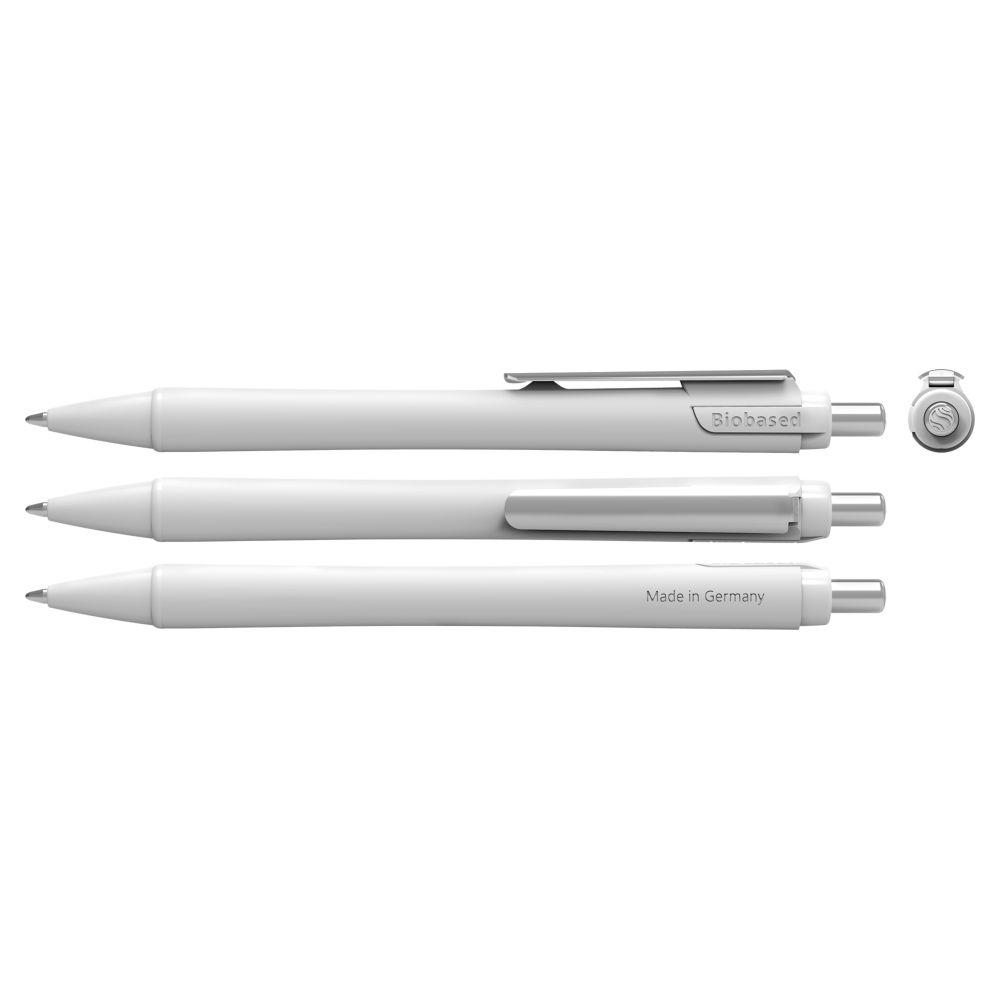 Druckkugelschreiber mit weißem *Gehäuse aus 70 % biobasiertem Kunststoff. Die Viscoglide®-Technologie sorgt für außergewöhnlich weiches und gleitendes Schreiben. Leicht konkav geformter Schaft und stabiler Metallclip. Zierring und Schaftverlängerung farblich abgesetzt. Ausgestattet mit Schneider-Mine 778 XB. Produkt mit finanziellem Klimabeitrag: Kompensation in Höhe der unvermeidbaren Emissionen in ein zertifiziertes Klimaschutzprojekt. Gehäuse: weiß/schwarz. Schreibfarbe: schwarz.