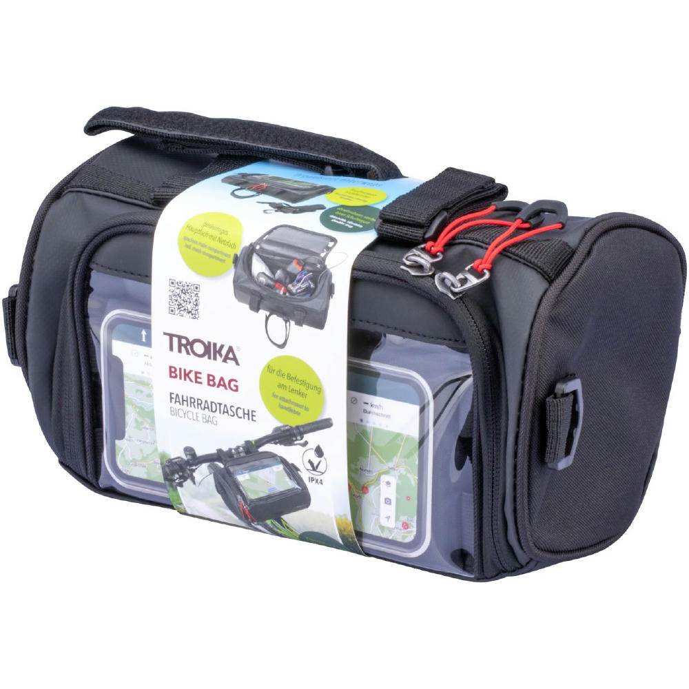 Fahrradtasche für den Lenker, flexible Befestigung mittels 3 Klettverschlussbändern am Lenker, geräumiges Hauptfach mit Reißverschluss, inkl. Netzfach (z.B.: für Powerbank), Touchscreen-Sichtfenster passend für gängige mobile Geräte zur Navigation, seitlich geöffnet zum Hauptfach (Laden via Powerbank), abnehmbarer, verstellbarer Schultergurt, Schlaufe zur Befestigung des Vorderlichts, Kapazität ca. 4 Liter, Tragkraft bis zu 5 kg, schützt Inhalt vor Spritzwasser (Wasserdichtheitsgrad IPX4) , formstabil durch verstärkte Kanten.