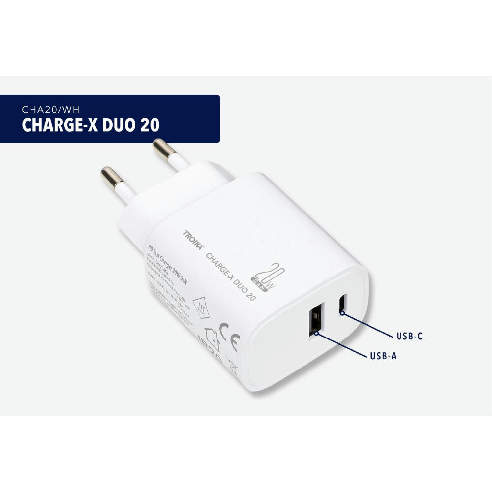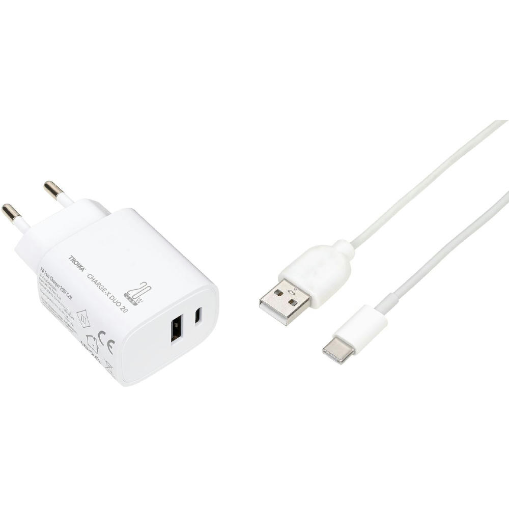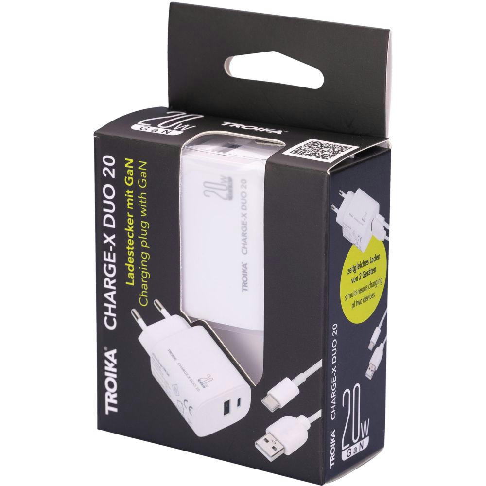 Ladestecker mit GaN - und Schnellladetechnologie Power Delivery, 20W mit USB-C und USB-A Anschluss, zum gleichzeitigen Laden von zwei Geräten.