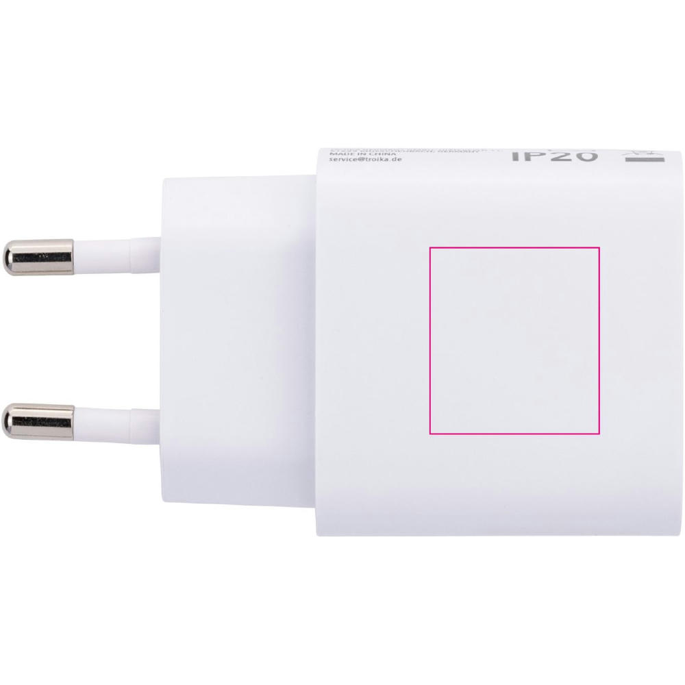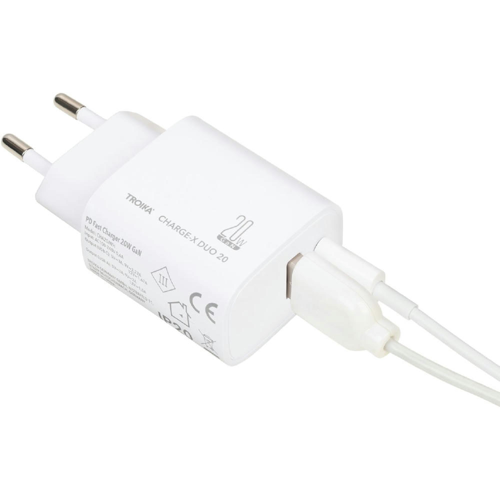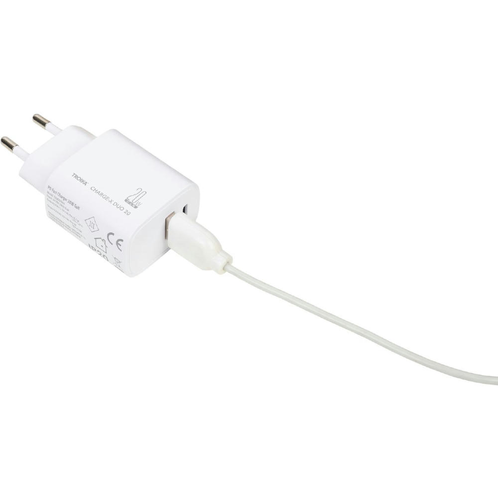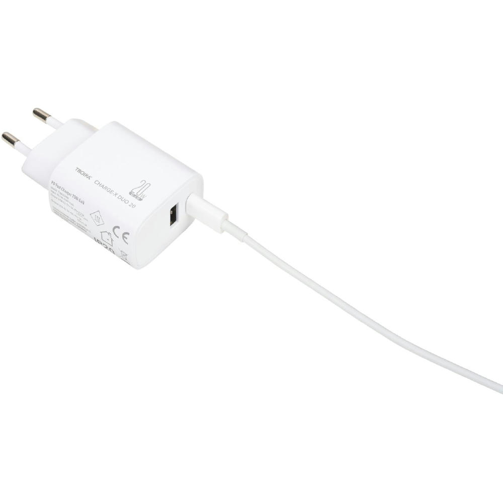 Ladestecker mit GaN - und Schnellladetechnologie Power Delivery, 20W mit USB-C und USB-A Anschluss, zum gleichzeitigen Laden von zwei Geräten.