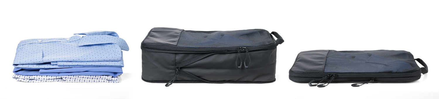 Dreiteilig für verschiedene Kleidungsstücke: Größe L für Hemden & Hosen, Größe M für Shirts und Größe S für Socken und Wäsche – platzsparend, geordnet und knitterfrei. Durch verschließen des Netzfach-Reißverschlusses wird der Inhalt vollständig komprimiert.