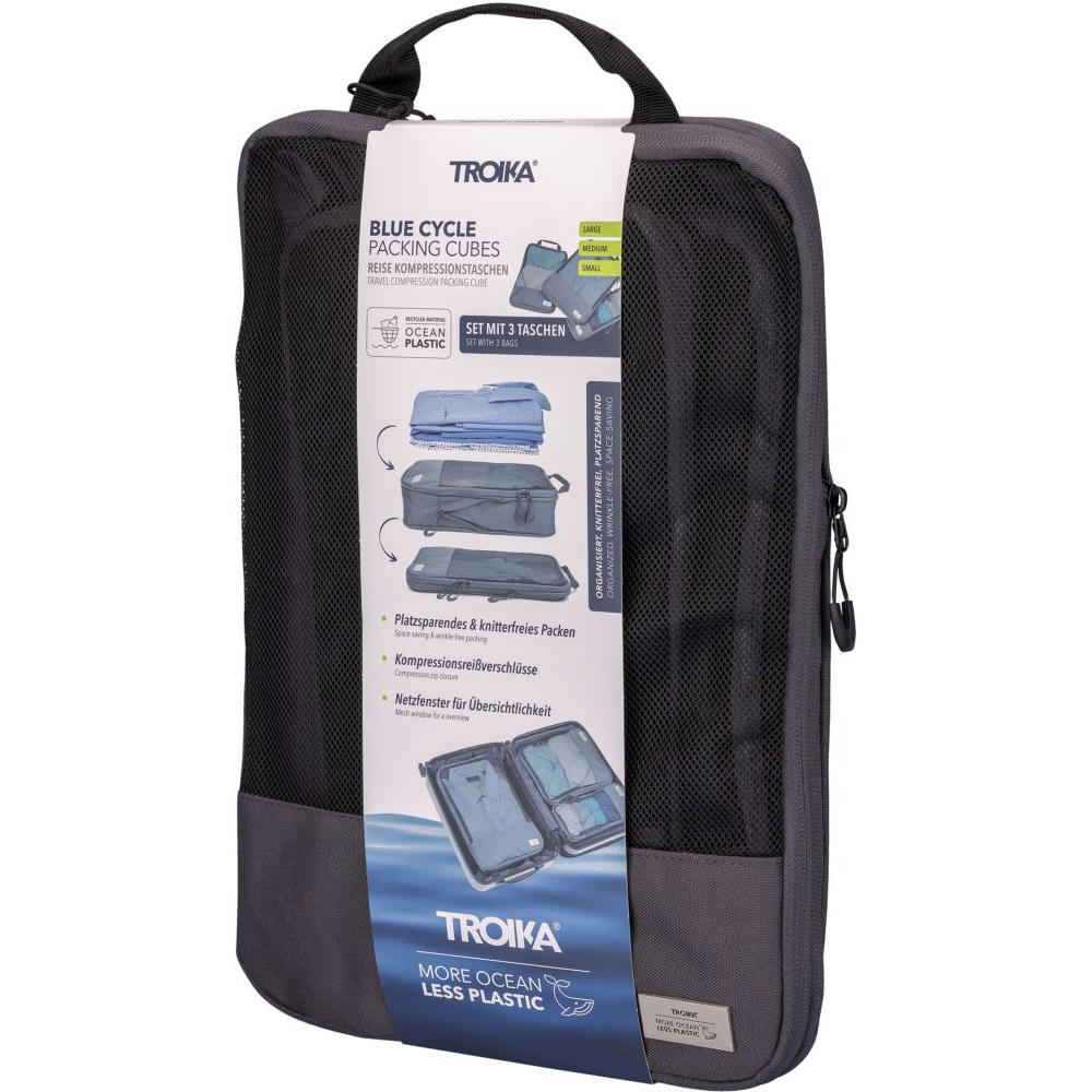 Dreiteilig für verschiedene Kleidungsstücke: Größe L für Hemden & Hosen, Größe M für Shirts und Größe S für Socken und Wäsche – für platzsparendes, geordnetes und knitterfreies Packen von Kleidung in Koffer & Rucksack. Durch Verschließen des Netzfach-Reißverschlusses wird der Inhalt vollständig komprimiert.