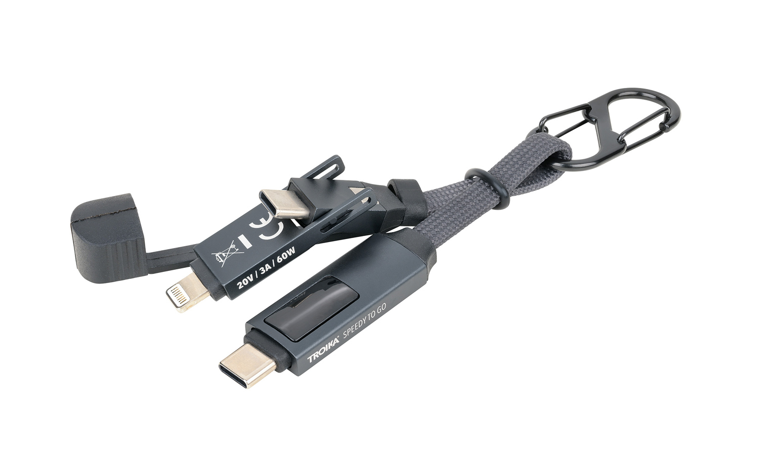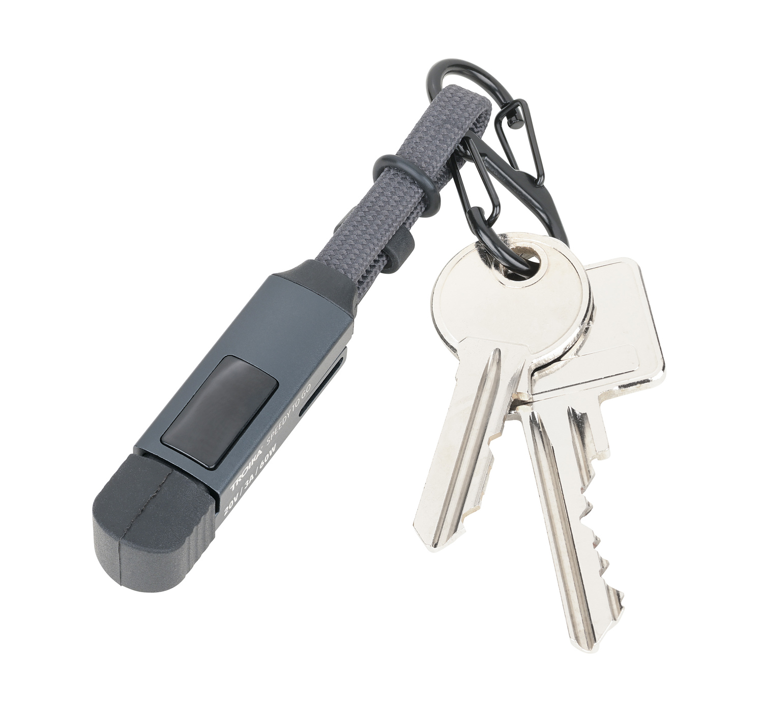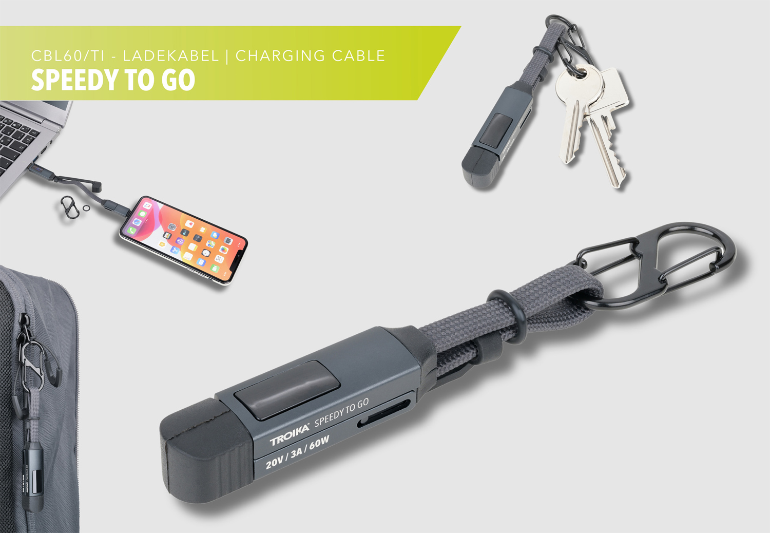 Taschenanhänger mit Ladekabel: High-Speed USB-C 60W PD Power Delivery auf USB-C, mit Datenübertragungsfunktion, volle Ladekapazität: max. 60W|20V|3A (ohne Adapter), abhängig vom zu beladenen Gerät, mit digitaler Anzeige der Ladeleistung, inkl. USB-C auf Lightning Adapter, mit Doppelkarabiner zur Befestigung an Schlüsselbund, (Sport-)Tasche o.Ä., mit Magnetverschluss und Kappe.