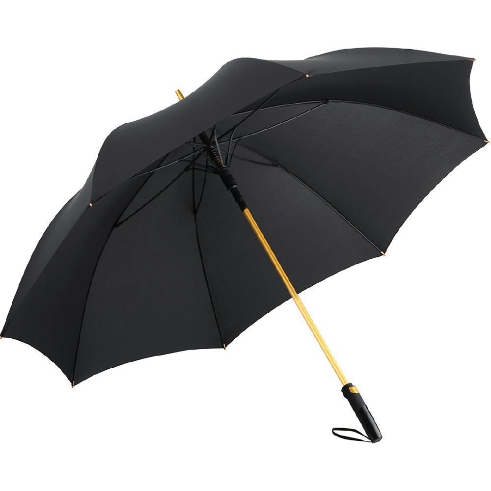Edler Automatik-Gästeschirm für zwei Personen mit Elementen in Metallic-Farben. Komfortable Automatik-Funktion zum schnellen Öffnen, hochwertiges Windproof-PLUS-System für eine maximale Gestell-Flexibilität bei stärkeren Windböen, flexible Fiberglasschienen, Aluminiumstock in matter Metallic-Farbe, Metall-Spitzen und Metall-Druckknopf am Schließband farblich passend zum Stock, matt/glänzend abgesetzter Soft-Feel-Griff mit integrierter Auslösetaste und Werbeanbringungsmöglichkeit