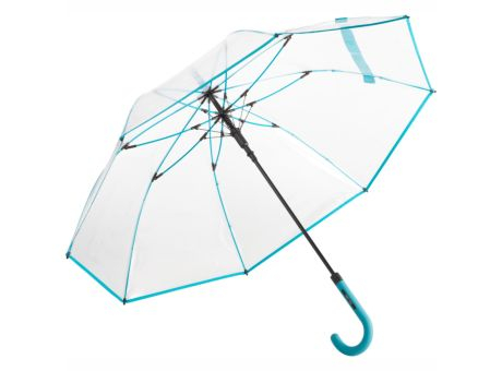 Ansprechender Automatik-Stockschirm mit transparentem Bezug und farbigen Details. Komfortable Automatik-Funktion zum schnellen Öffnen, hochwertiges Windproof-PLUS-System für eine maximale Gestell-Flexibilität bei stärkeren Windböen, flexible Fiberglasschienen, farblich aufeinander abgestimmte Design-Elemente, handsympathischer Soft-Touch-Rundhakengriff mit integrierter Auslösetaste und Werbeanbringungsmöglichkeit, höherer Korrosionsschutz durch schwarze Galvanisierung des Stahlstocks