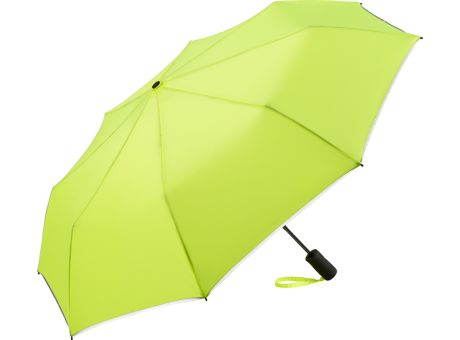 Stabiler Automatik-Taschenschirm mit modisch reflektierender Paspelierung. Komfortable Automatik-Funktion zum schnellen Öffnen, hochwertiges Windproof-PLUS-System für eine maximale Gestell-Flexibilität bei stärkeren Windböen, Bezug mit modischer Reflexpaspel in silber, Soft-Touch-Griff mit glänzender Auslösetaste und Werbeanbringungsmöglichkeit, Futteral mit modischer Reflexpaspel