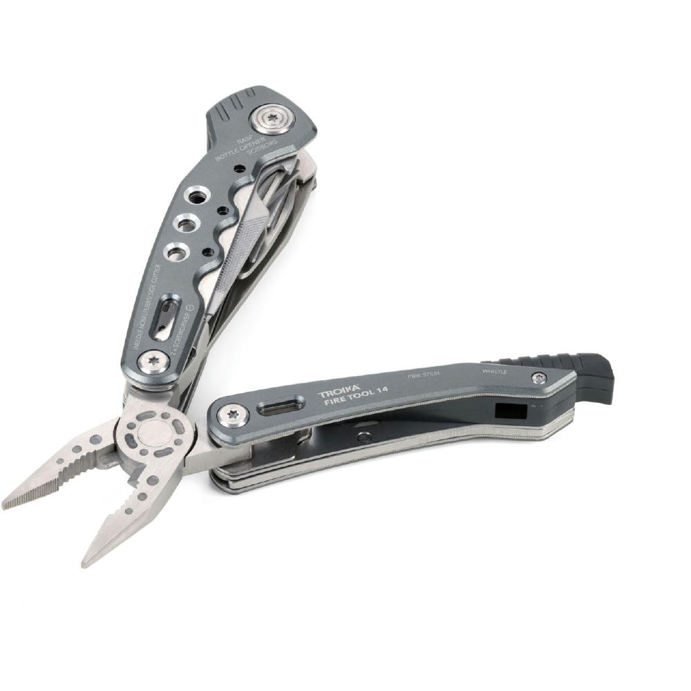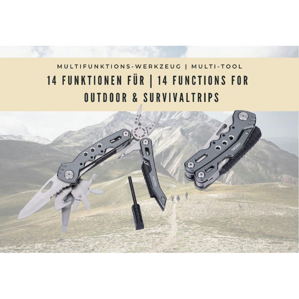 Multifunktions-Werkzeug mit 14 Funktionen, integrierte Feder und Feststellfunktion, Spitzzange, Zange, SeitenSCHNEIDER, Messer, Säge, Schere, Paketmesser, Schlitzschraubendreher in 2 Größen, Flaschenöffner, Kreuzschraubendreher, Feile, Feuerstahl, Pfeife. In Nylontasche mit Gürtelschlaufe.