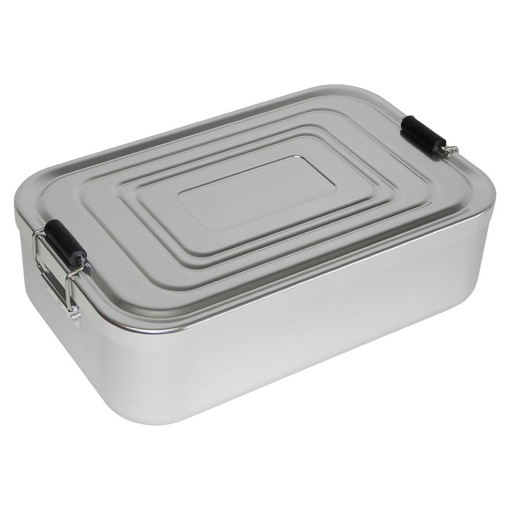 Lunchbox XXL aus Aluminium mit Klemmbügeln für sicheres Verschließen. Der Deckel ist komplett abnehmbar und enthält im Inneren eine Silikonabdichtung. Die Brotdose aus Aluminium ist nur für Handwäsche geeignet Maße: 23 x 14,5 x 6,5 cm, Inhalt: 2,1 l.