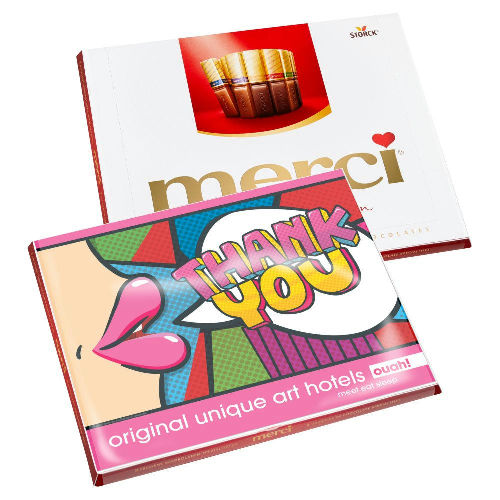 Feinste Schokoladen in Stäbchenform, hergestellt aus erlesenen Zutaten und einzeln golden verpackt. Genießen Sie Stück für Stück unsere liebevoll ausgewählten, hochwertigen Schokoladen, raffinierten Füllungen und einzigartigen Kompositionen. merci große Vielfalt mit 8 erlesenen Schokoladen-Spezialitäten: Edel-Rahm, Kaffee-Sahne, Mandel-Milch-Nuss, Edel-Nougat, Edel-Marzipan, Herbe Sahne, Dunkle Mousse, Milch-Praliné. Mit personalisierbarem Einschiebe-Cover in die Originalverpackung. Haltbarkeit: ca. 3 Monate bei sachgerechter Lagerung. Preis inkl. 4c Druck.