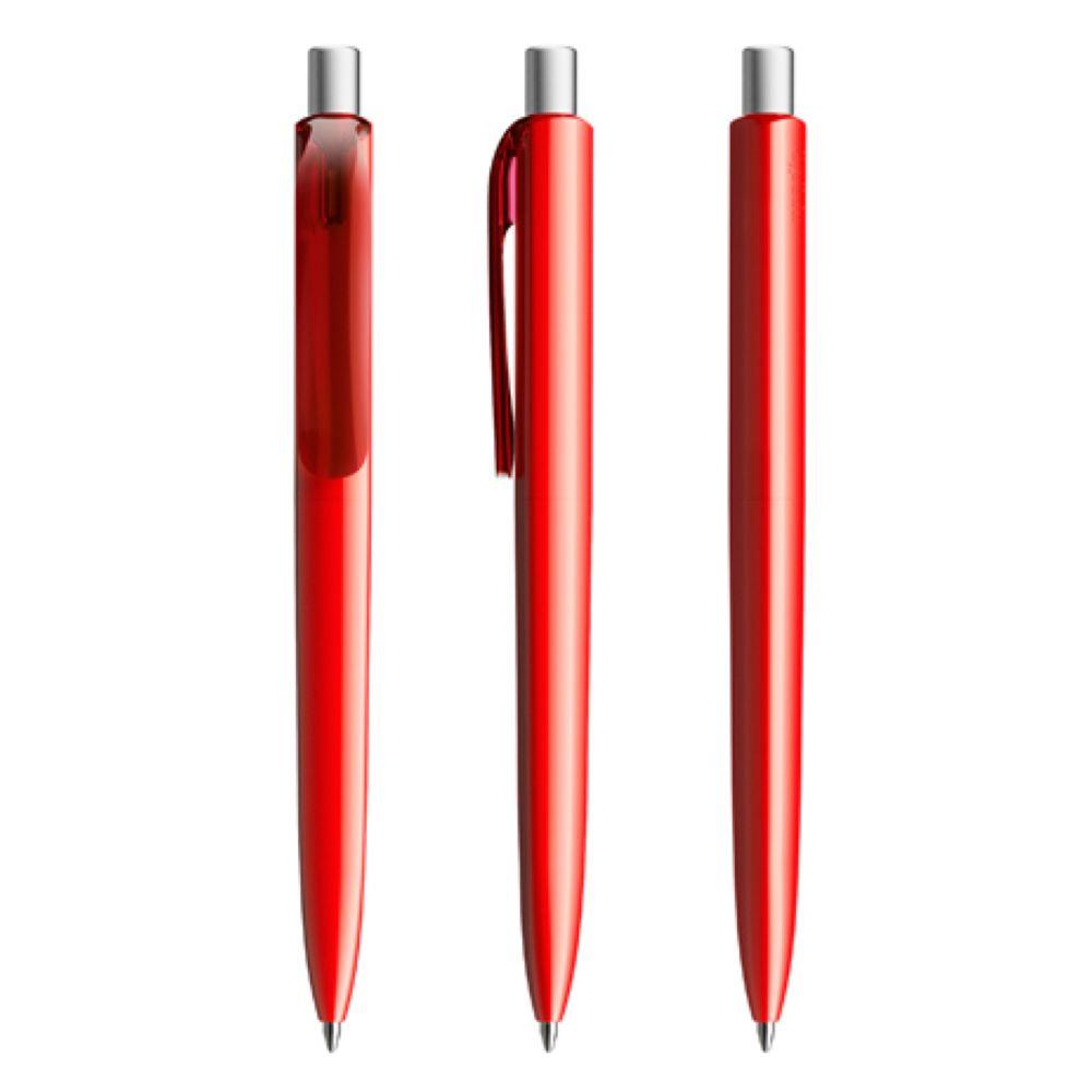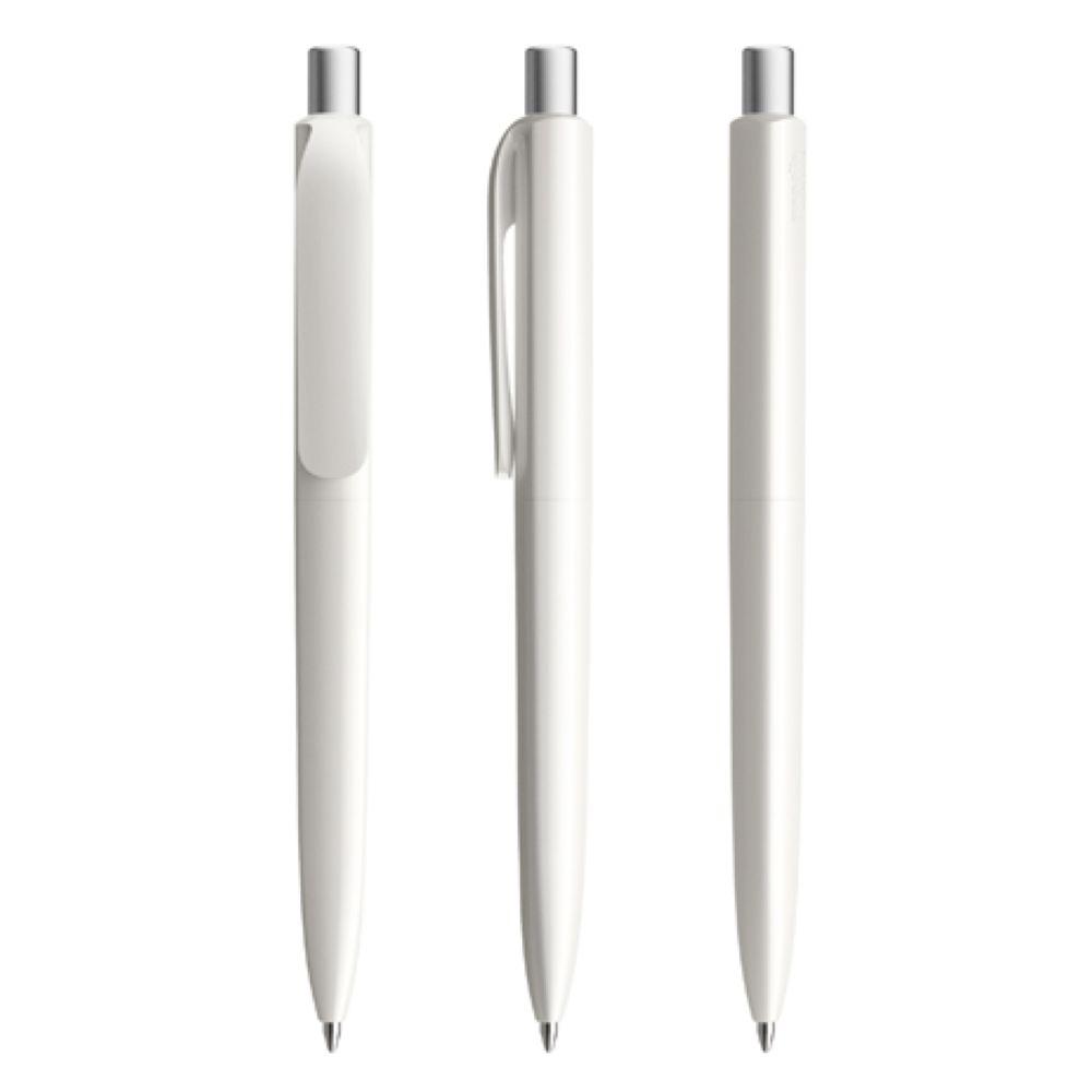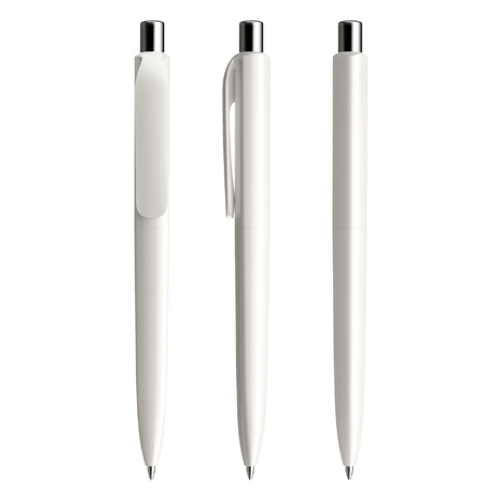 Die Ikone eines klassischen Schreibgerätes. Die zeitlose Interpretation der Dreiecksform, reduziert auf das Wesentliche und funktional bis ins kleinste Detail. Dem DS8 gelingt die Symbiose von exzellentem Schreibkomfort und werthaltiger Kommunikation. Seine zahlreichen Personalisierungsoptionen, Oberflächen, Farben und Materialien machen ihn zu einem vielseitig einsetzbaren Markenbotschafter. In der Ausführung mit vollfarben poliertem Gehäuse (PPP) lieferbar in vier Standardfarben, hergestellt mit einem Rezyklatanteil von 100% (Schwarz und Weiß) oder 50% (alle anderen Farben), gekennzeichnet mit dem internationalen Recycling-Symbol. Sondergehäusefarben ab 5.000 Stück. Fünf Druckflächen für Werbeanbringungen stehen zur Verfügung. Clip und Druckknopf sind in transparenter Oberfläche (bei Weiß und Schwarz sind Clip und Knopf auch vollfarben). Polierter oder satinierter Metalldruckknopf als Option. Ausgestattet mit der umweltfreundlichen auswechselbaren FLOATING BALL® lead free-Großraummine 1.0, Schreiblänge 5.000 m, Schreibfarbe Blau oder Schwarz.