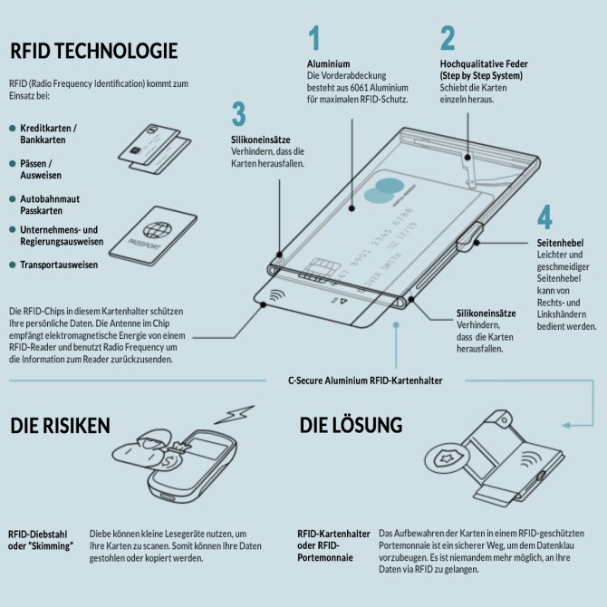 Machen Sie jeden Geldbeutel, jedes Portemonnaie oder jeden Geldclip RFID sicher. Diese Karte zieht Energie von NFC/RFID Scannern und baut selbständig ein elektronisches Feld auf, das alle 13.56 Mhz Karten für etwaige Scanner unsichtbar macht. Es werden keine Batterien benötigt. 24/7 Schutz durch patentierte E-field-Technology gegen elektronischen Datenklau.